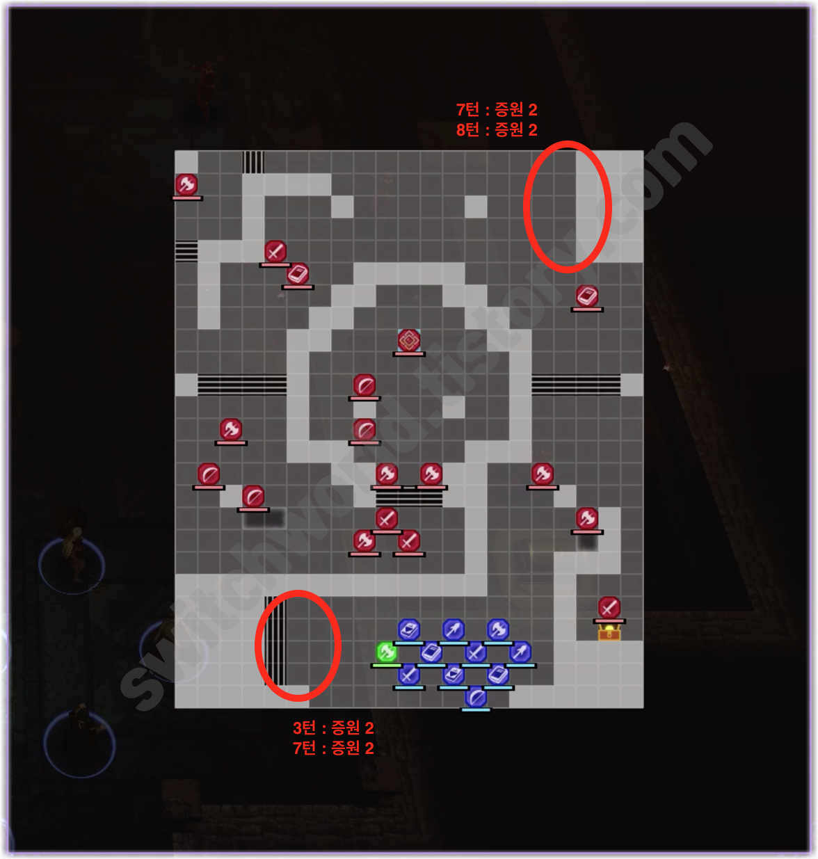 우선 전투가 시작되면 얼마 지나지 않아 남서쪽의 계단을 통해서 적들의 증원이 나타난다.