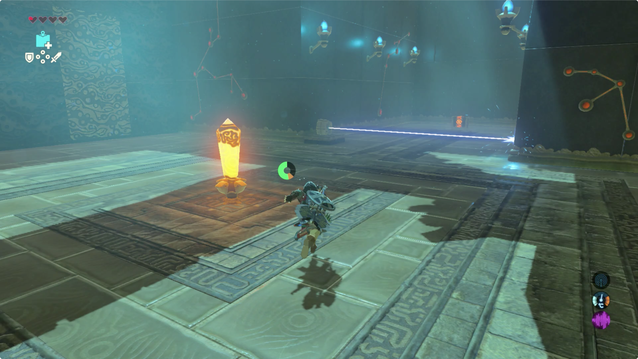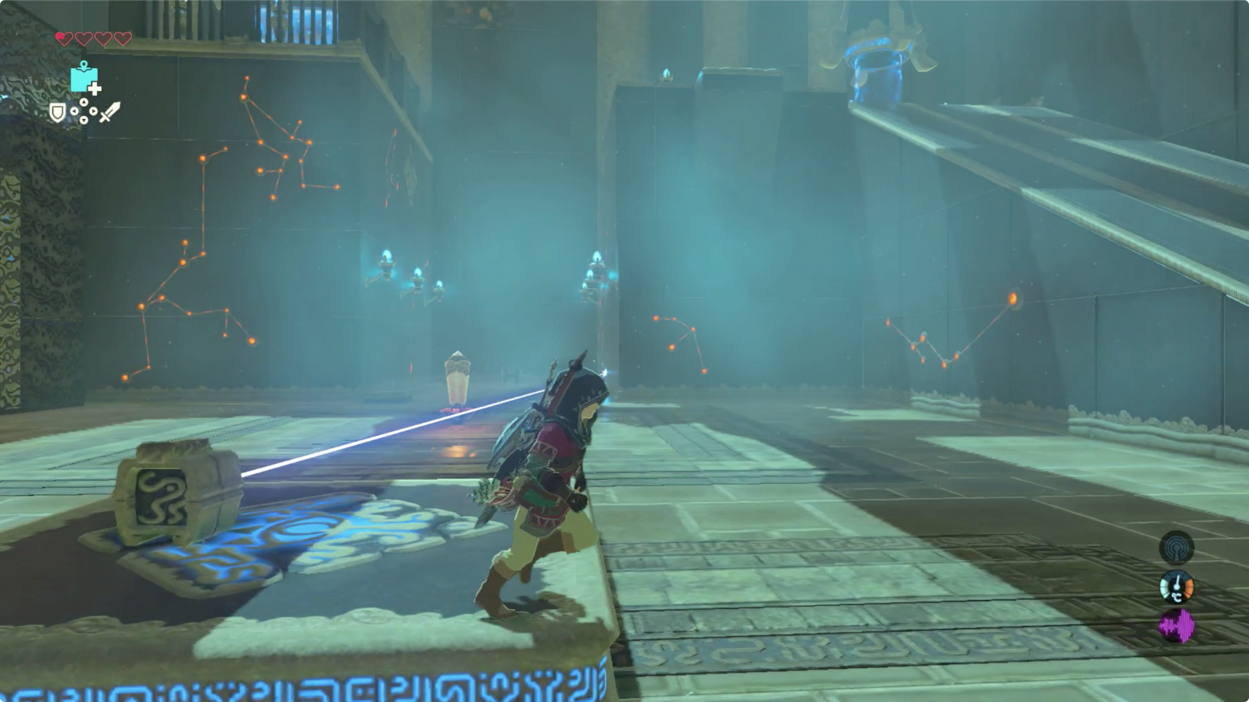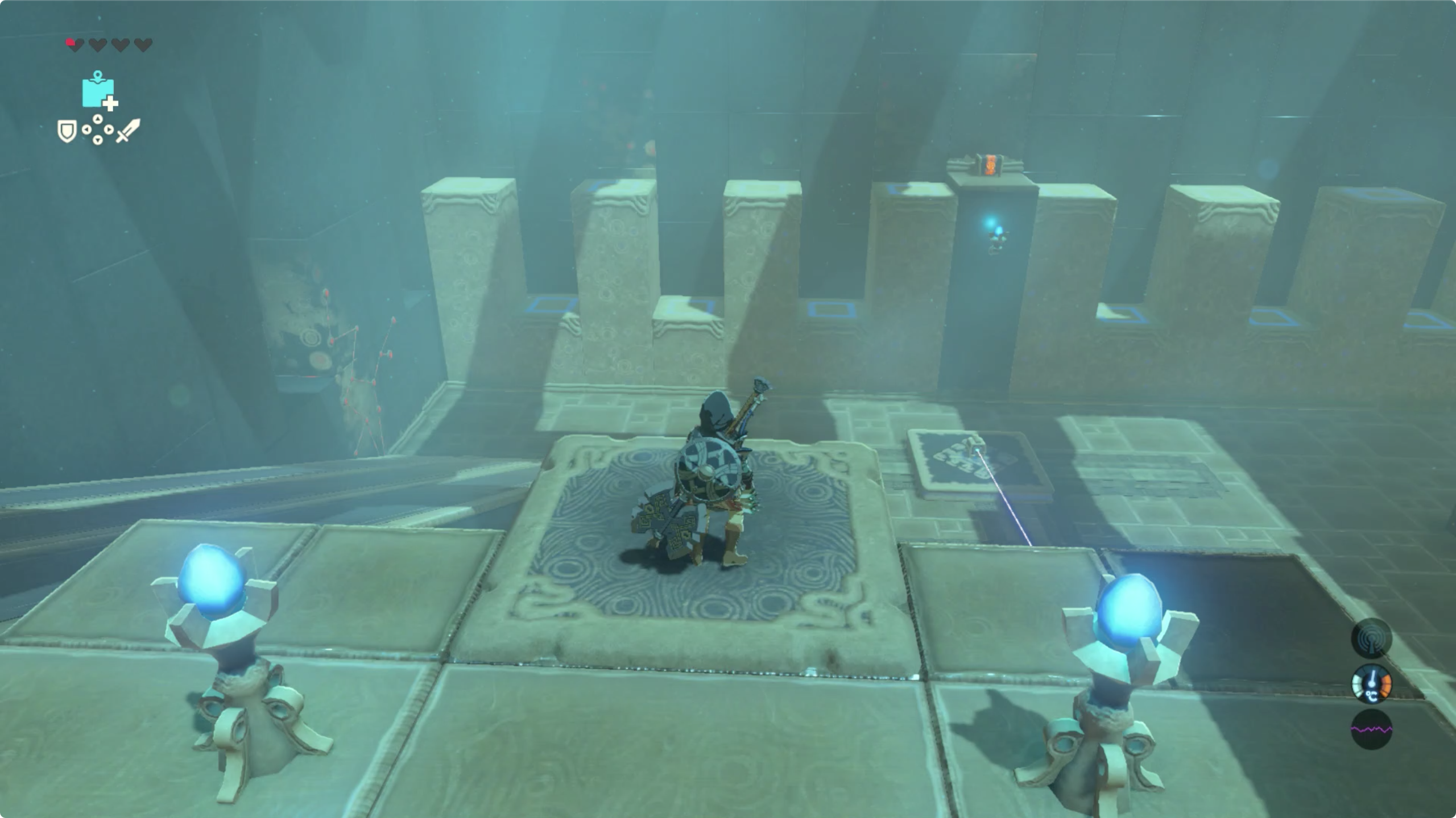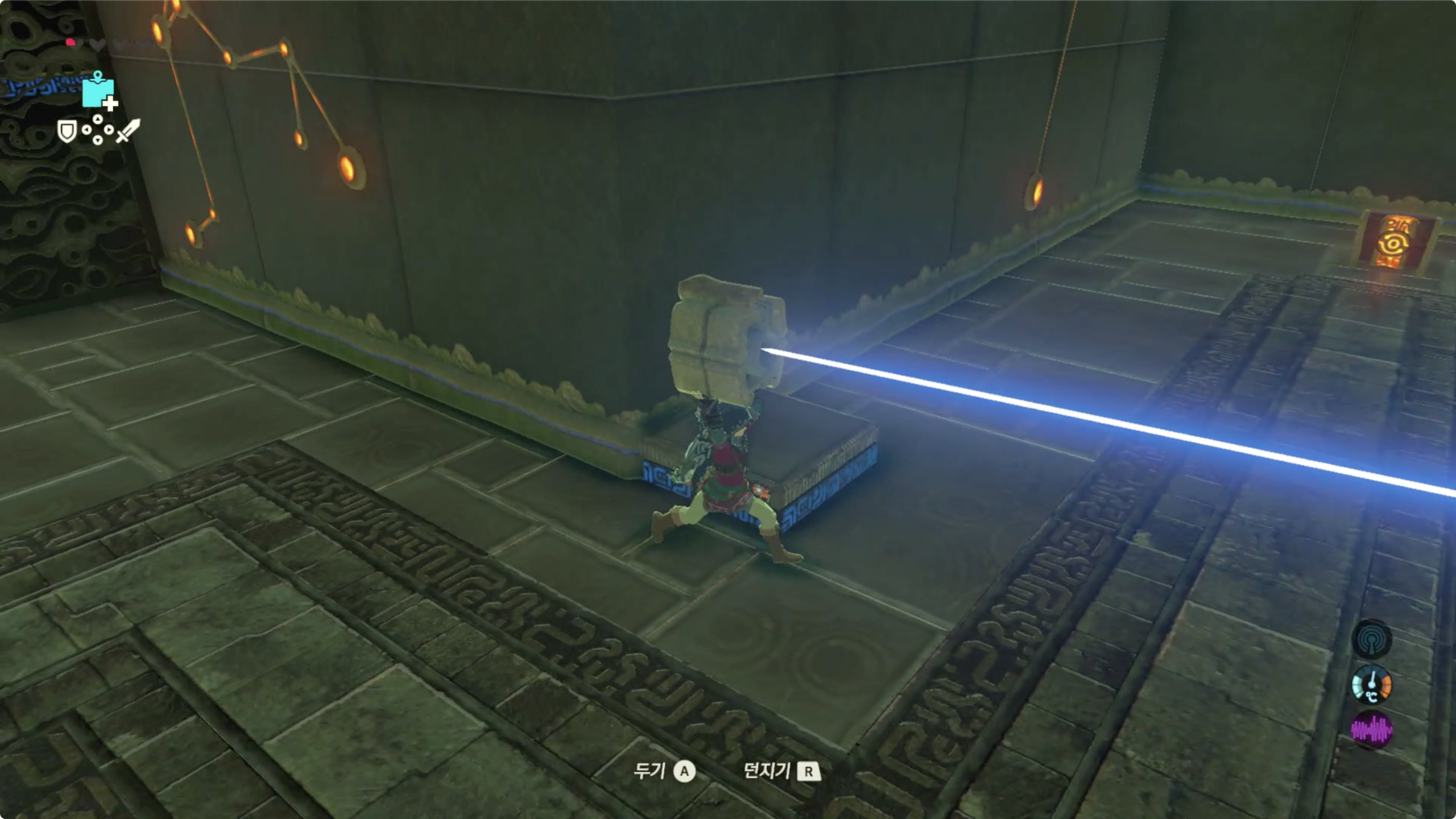 입구 오른쪽 아래를 보면 보물 상자와 레이저를 쏘는 장치가 있습니다.