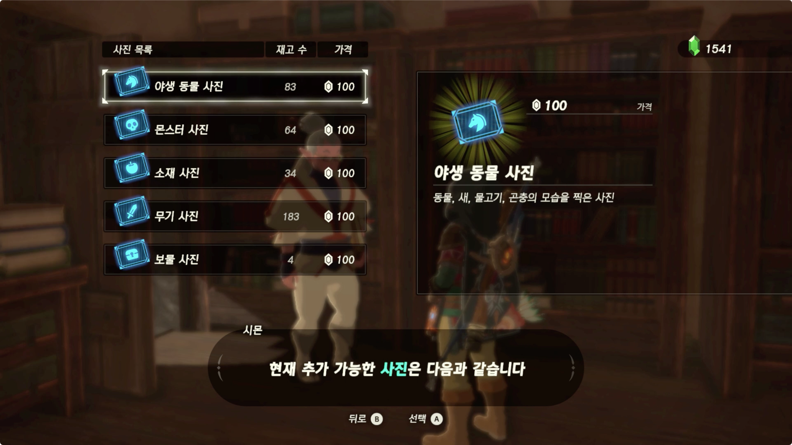 그러면 미니 챌린지가 완료되며, 이제 시몬에게서 도감을 채울 사진들을 루피로 구입할 수 있게 된다.