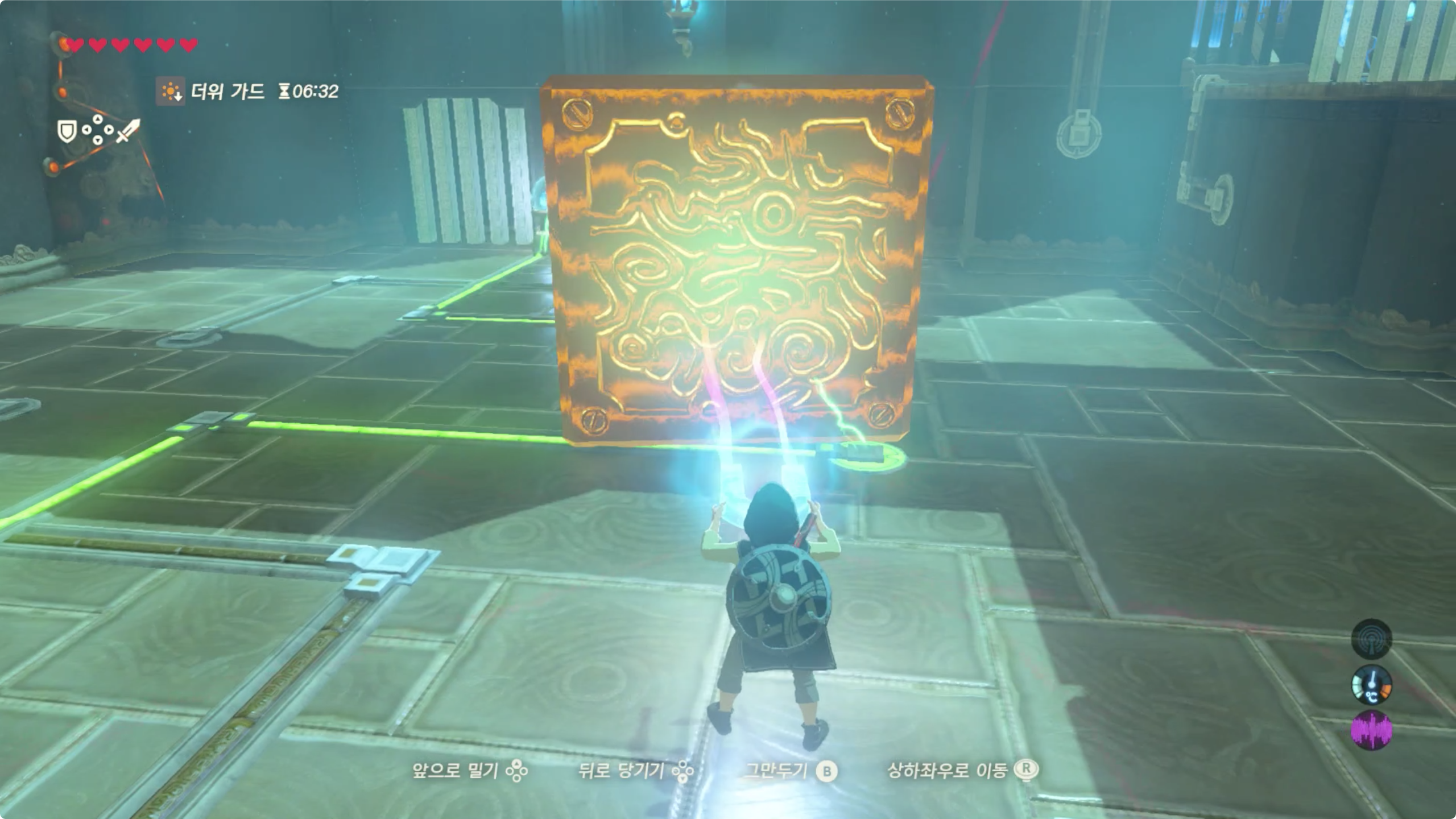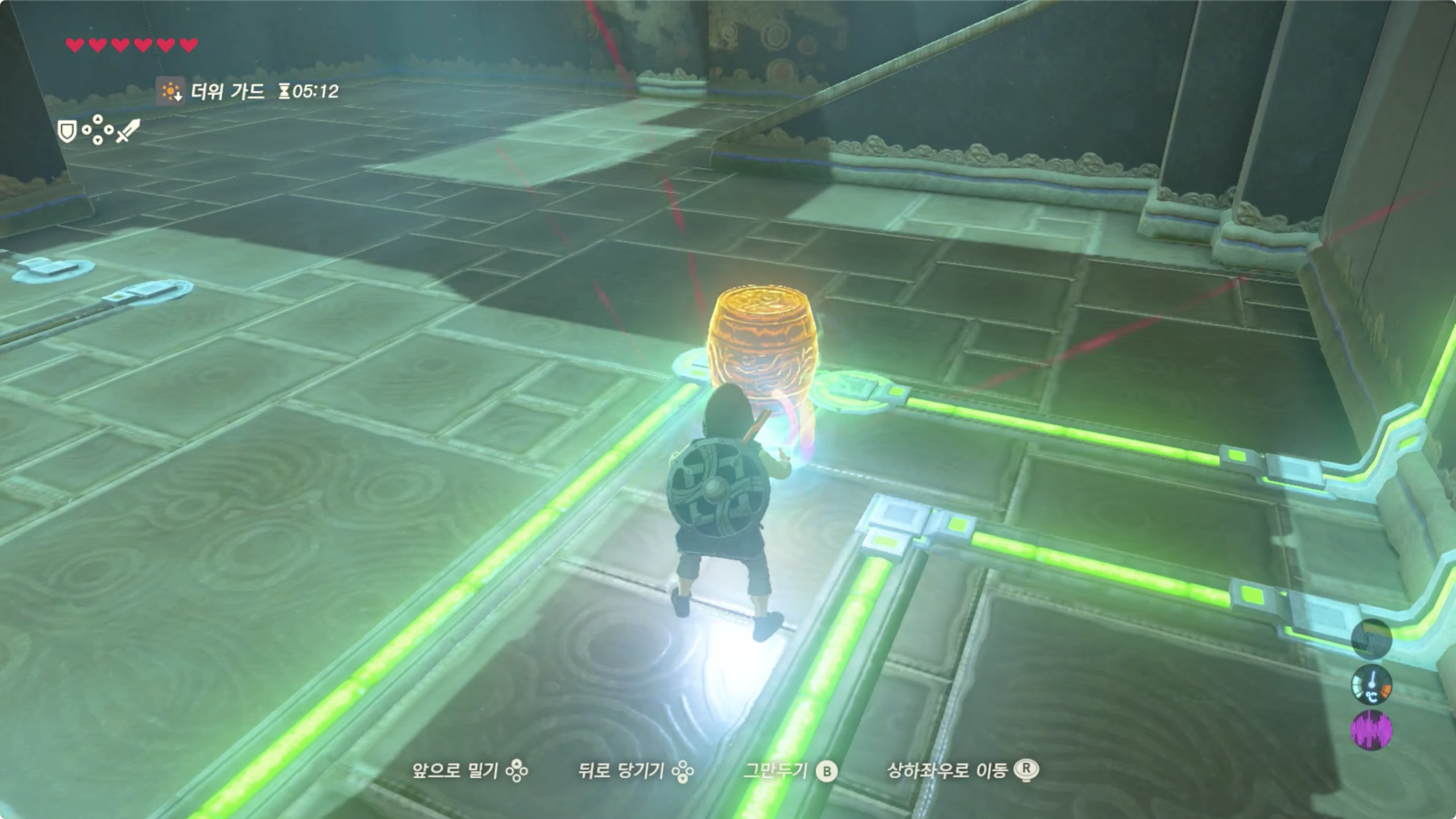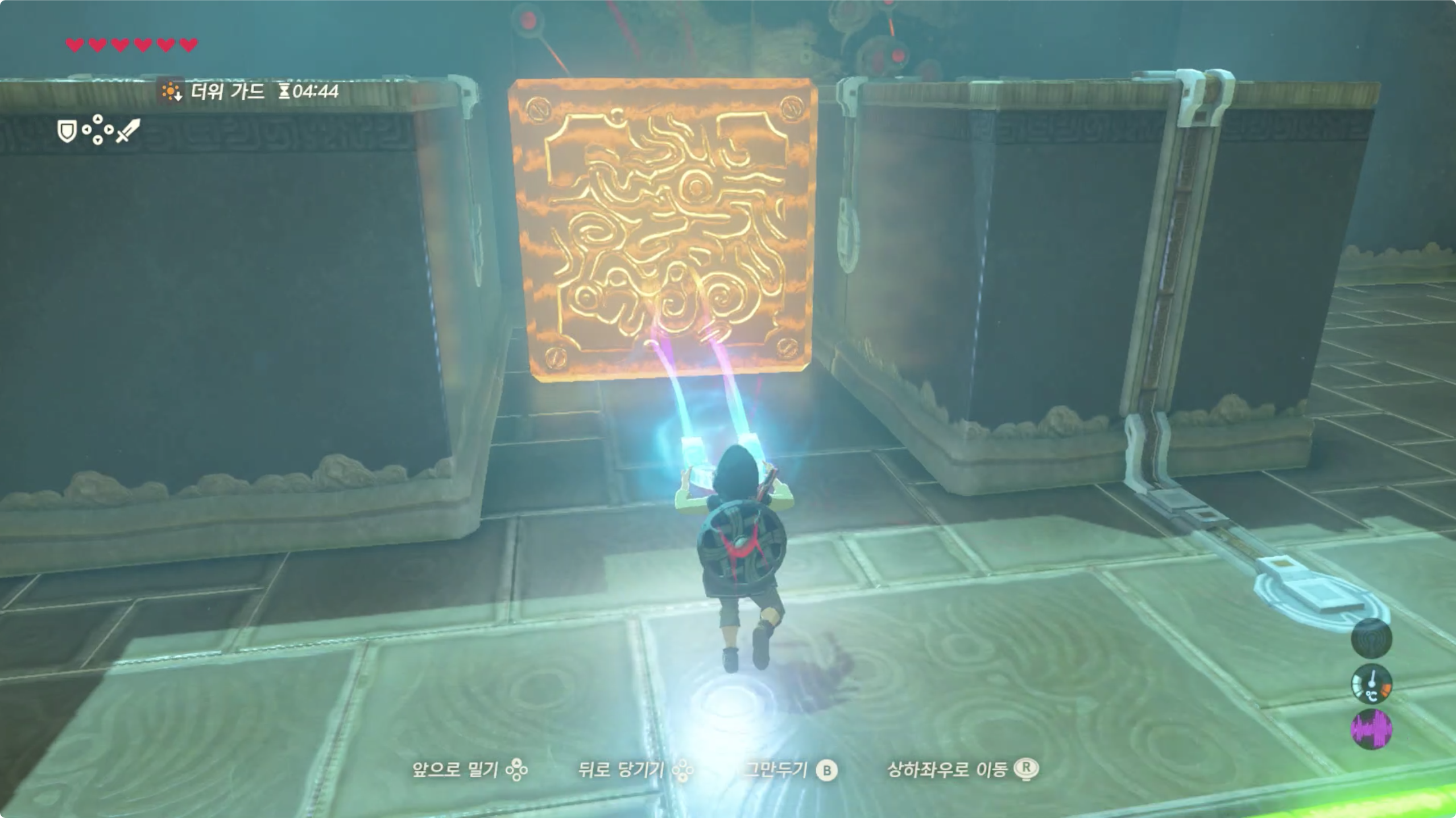 이렇게 세번째 문에서 큰 철로된 상자를 구할 수 있게 되며, 이상자들을 다음처럼 배치해주면 이 사당 챌린지도 완료하게 된다.
