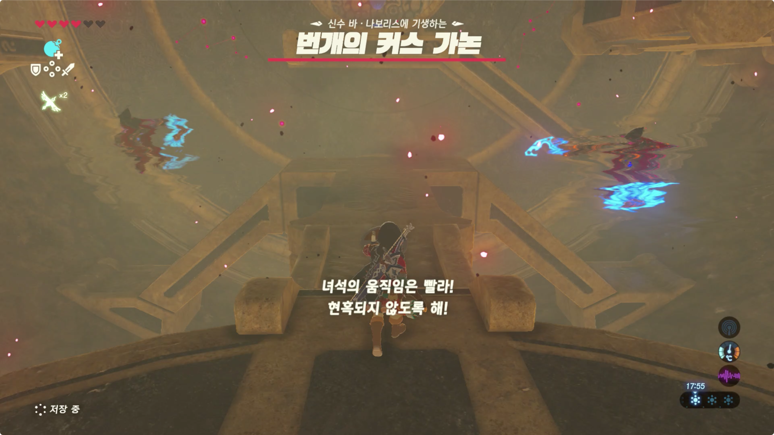 우선 다음과 같은 위치로 제빨리 올라가줍니다. 커스 가논은 정해진 위치 (좌 상단, 우 상단) 왔다갔다 하면서 기둥을 떨어뜨리고 그곳에 전기를 쏩니다.