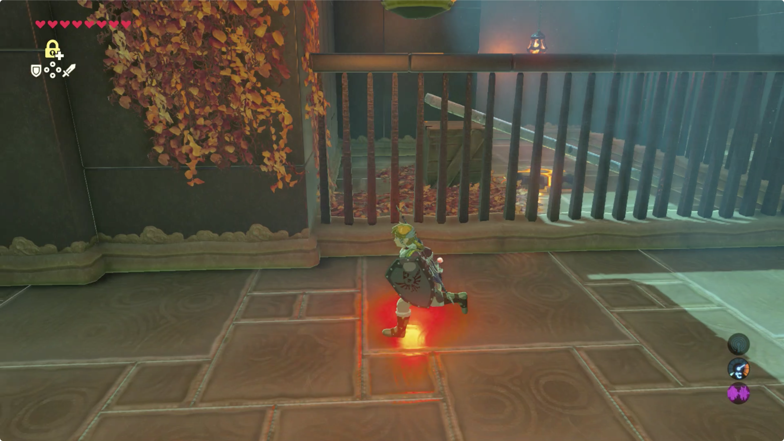파이어 로드를 가지고 있어서 그냥 때렸지만... 보통 화톳불이 쓰러져 있다던가 줄에 메달려 있다던가 하니깐 화살로 불을 붙여 불화살을 만들던지, 줄을 끊어 불을 나뭇잎 위로 떨어뜨리던지 하면 된다.