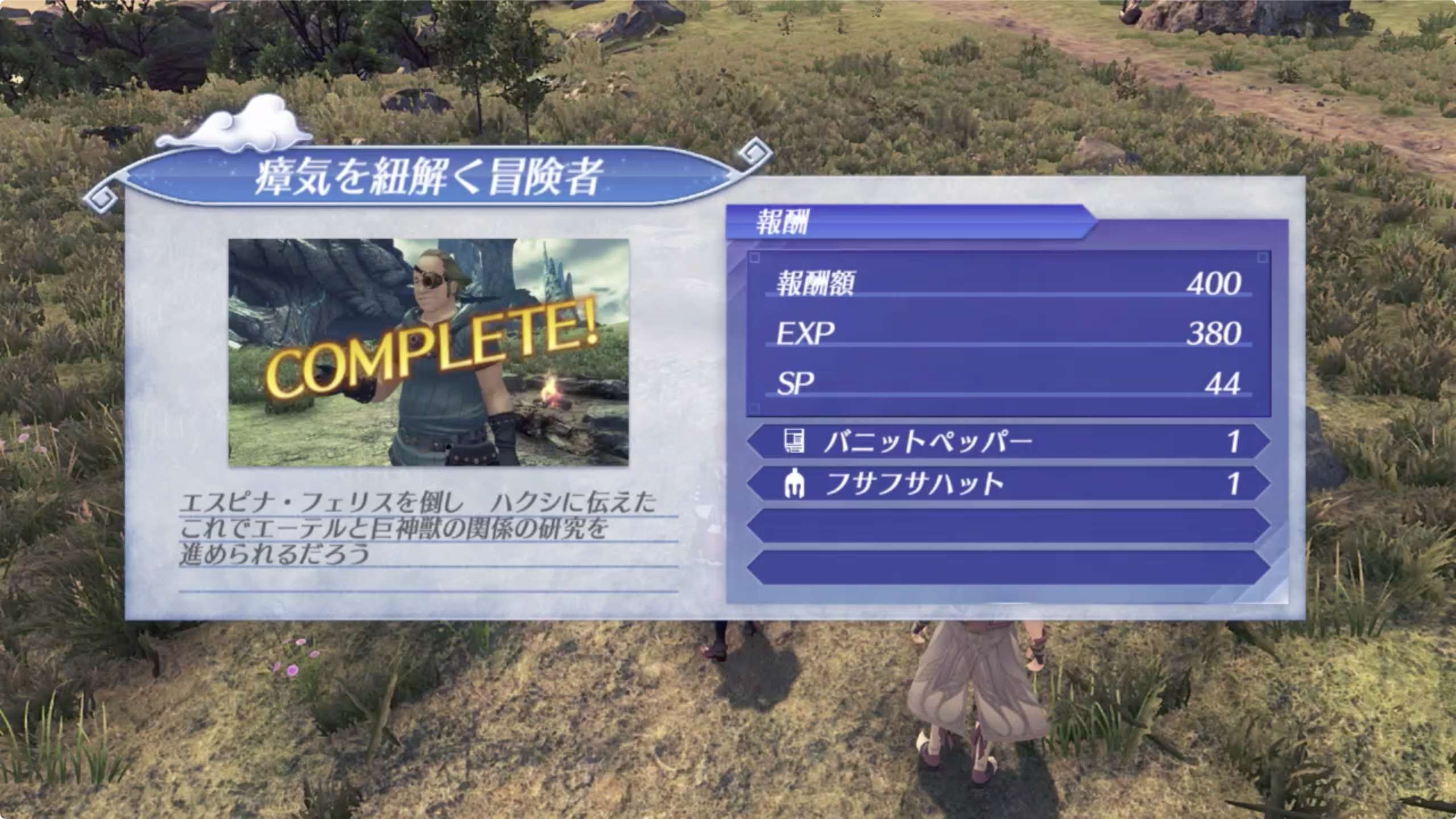 - 나침반을 따라 이동한 후 에스피나 페리스 Lv.13~Lv15 (エスピナ・フェリス)를 3마리 쓰러뜨린다. (캠프의 북쪽)