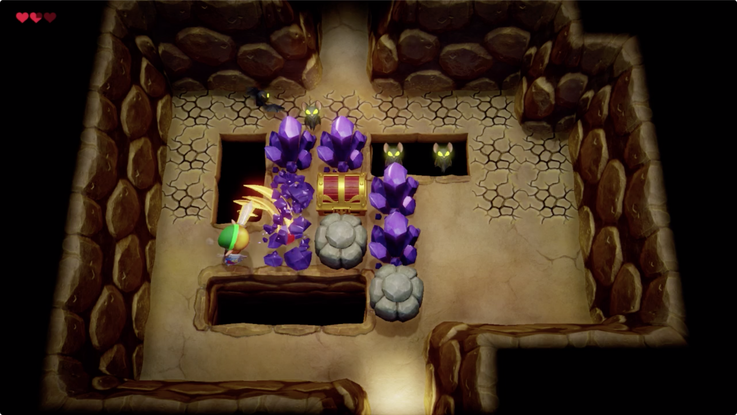 첫번째 방에서는 결정을 다 파괴하고 보물상자 앞의 돌을 밀어 보물상자의 내용물을 획득 할 수 있다. (50루피)