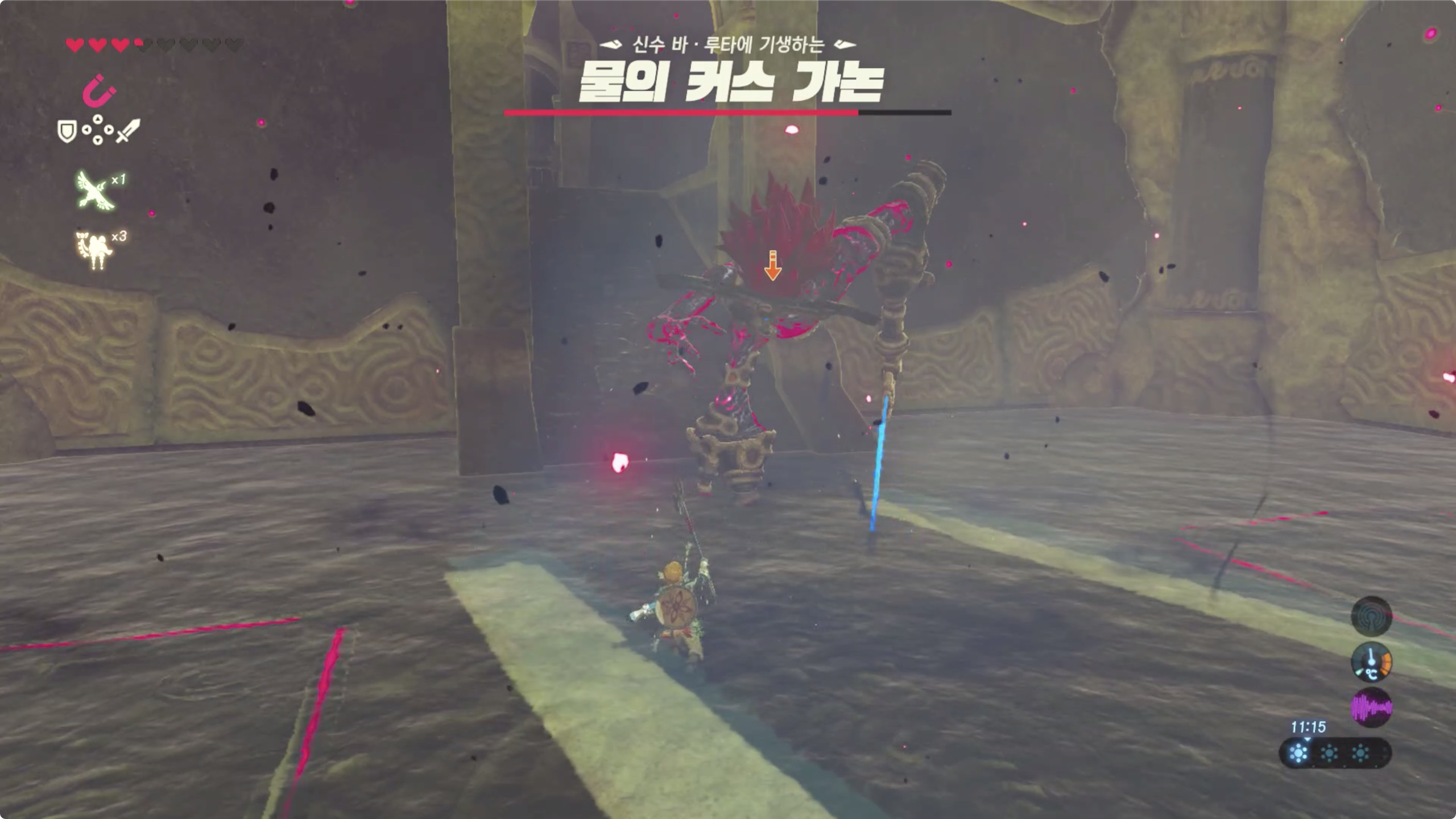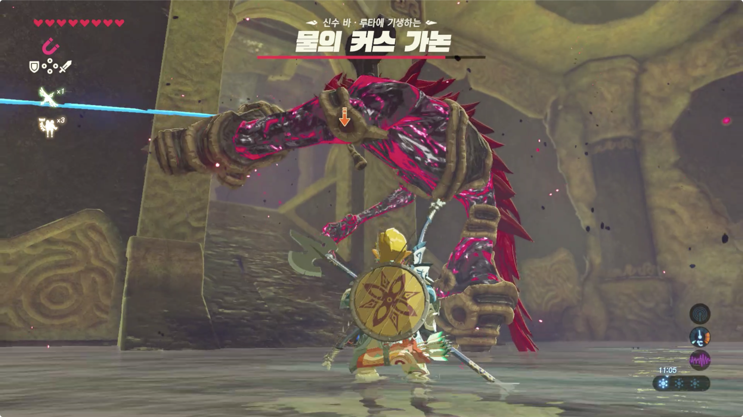 그럼 가논이 땅에 떨어지면서 기절하게되는데 이 때 제빨리 물을 건너가 또 한번 열심히 때리면 됩니다.
