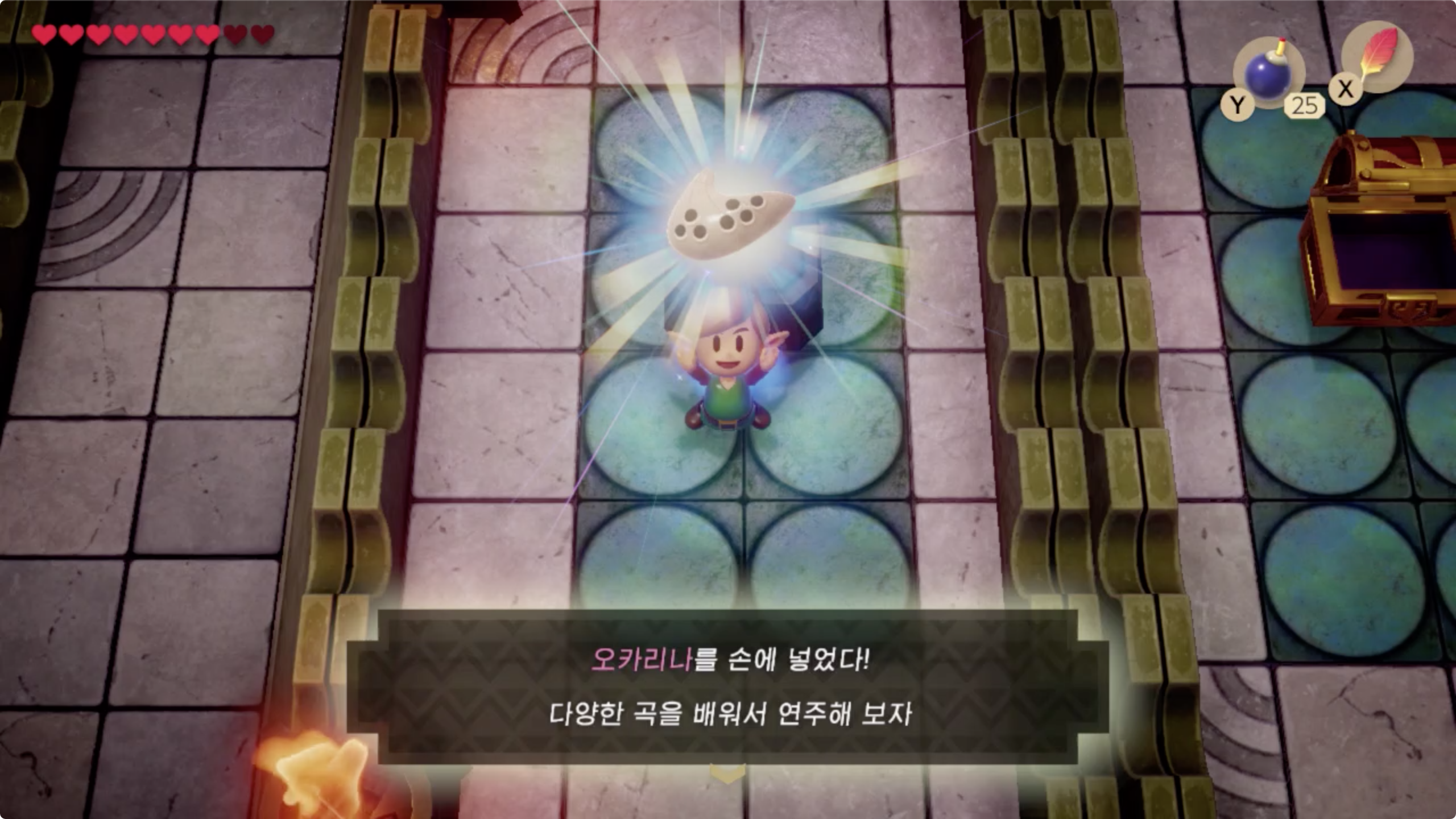 ◈ 중앙의 오른쪽 보물상자에서는 100 루피를, 왼쪽 에는 오카리나를 획득 할 수 있습니다.