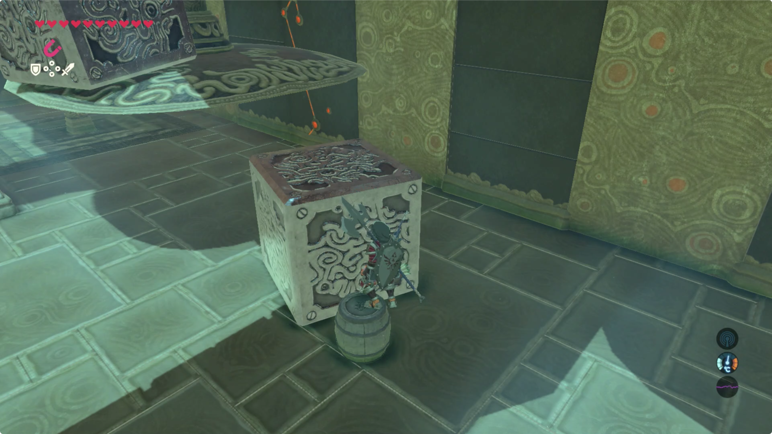 열쇠를 이용해 문을 열면 안에 철상자가 3개가 있으니 마그넷 캐치를 이용해 다 꺼내서 입구 왼쪽에 있는 천칭위로 올라가도록 하자.