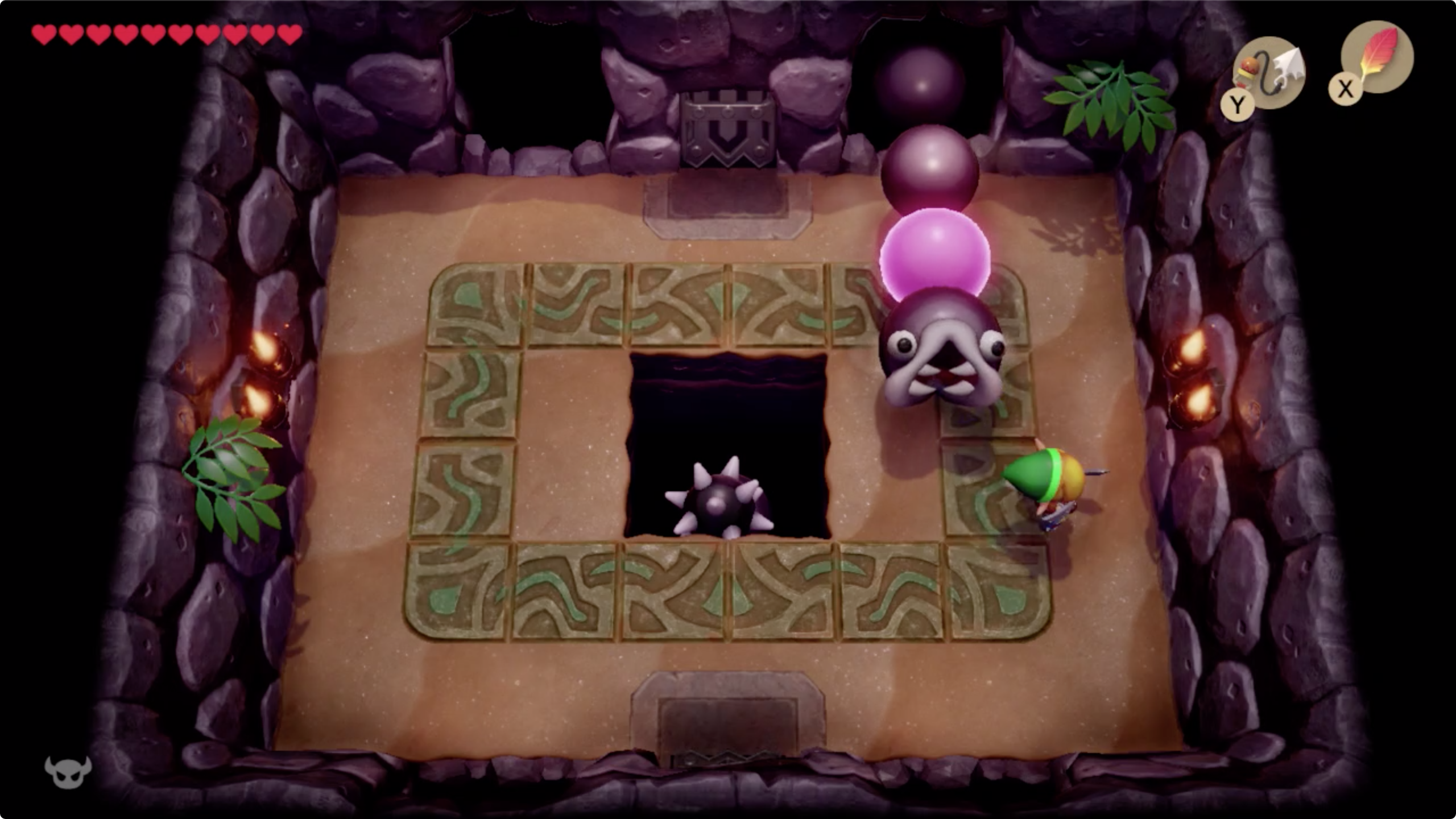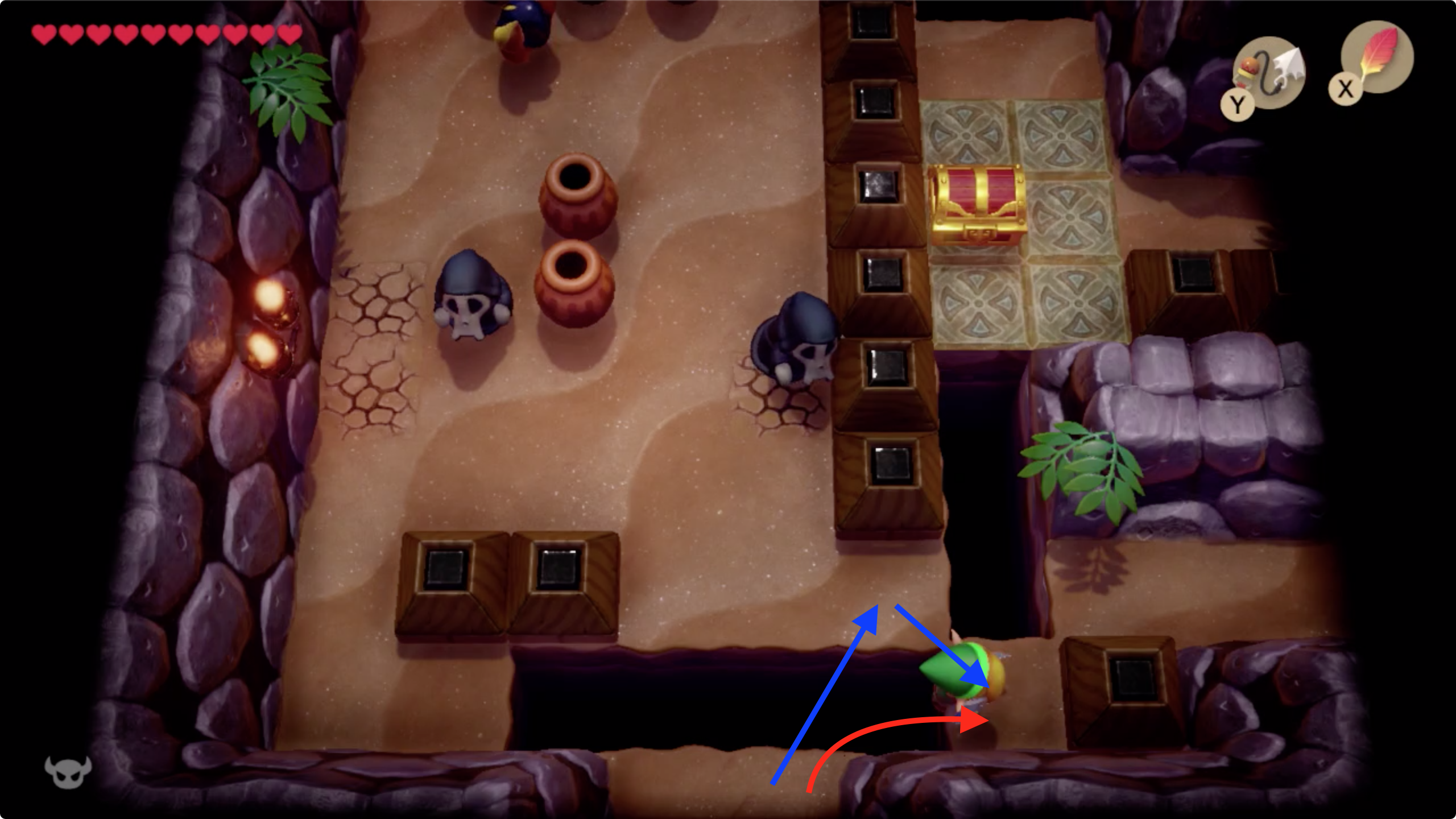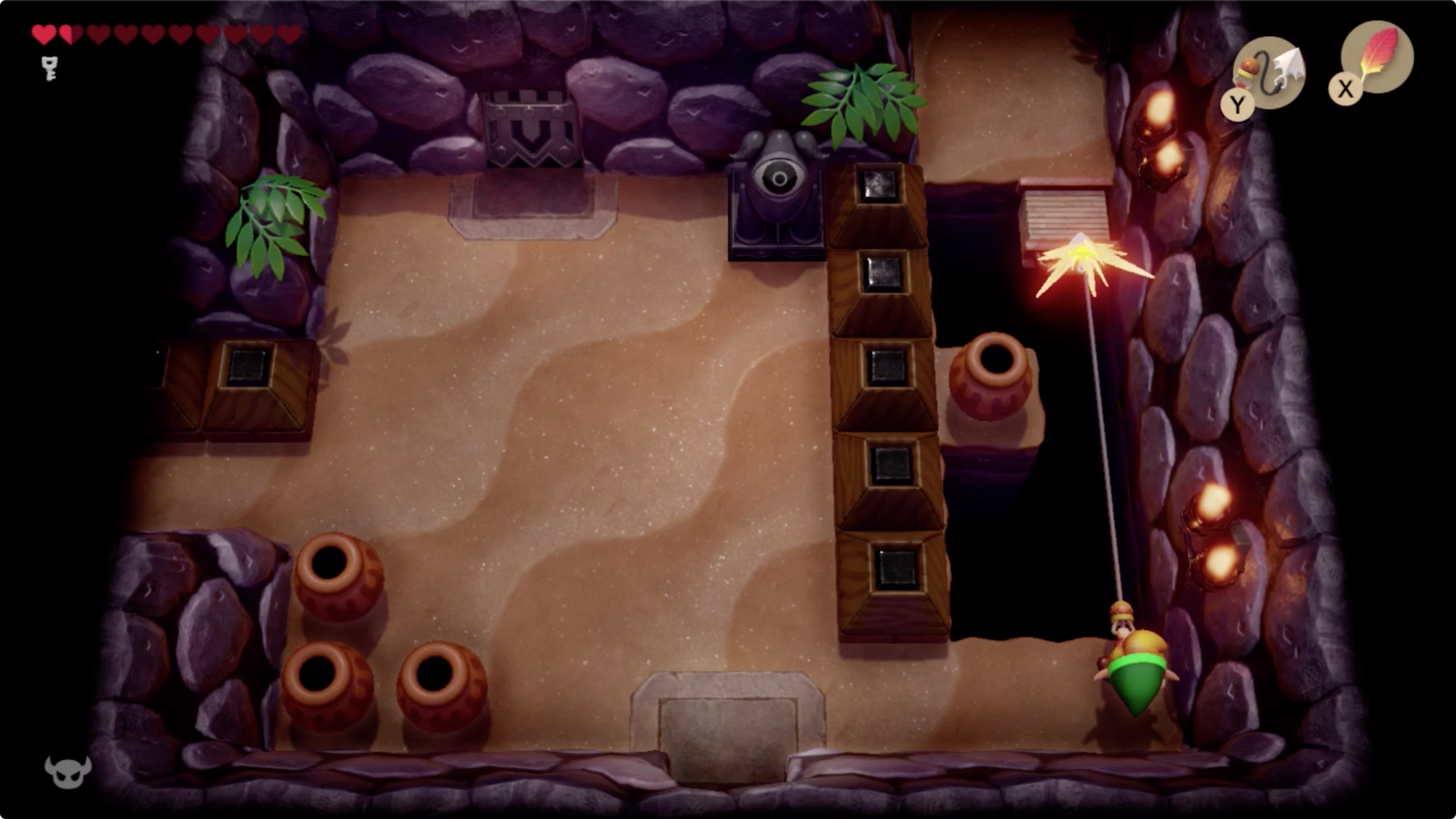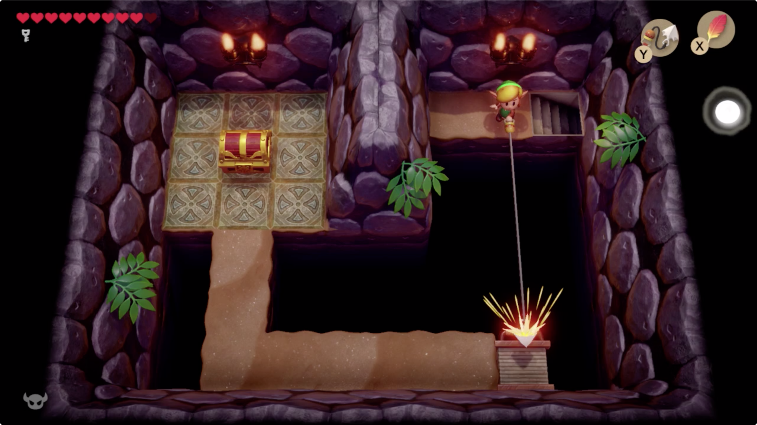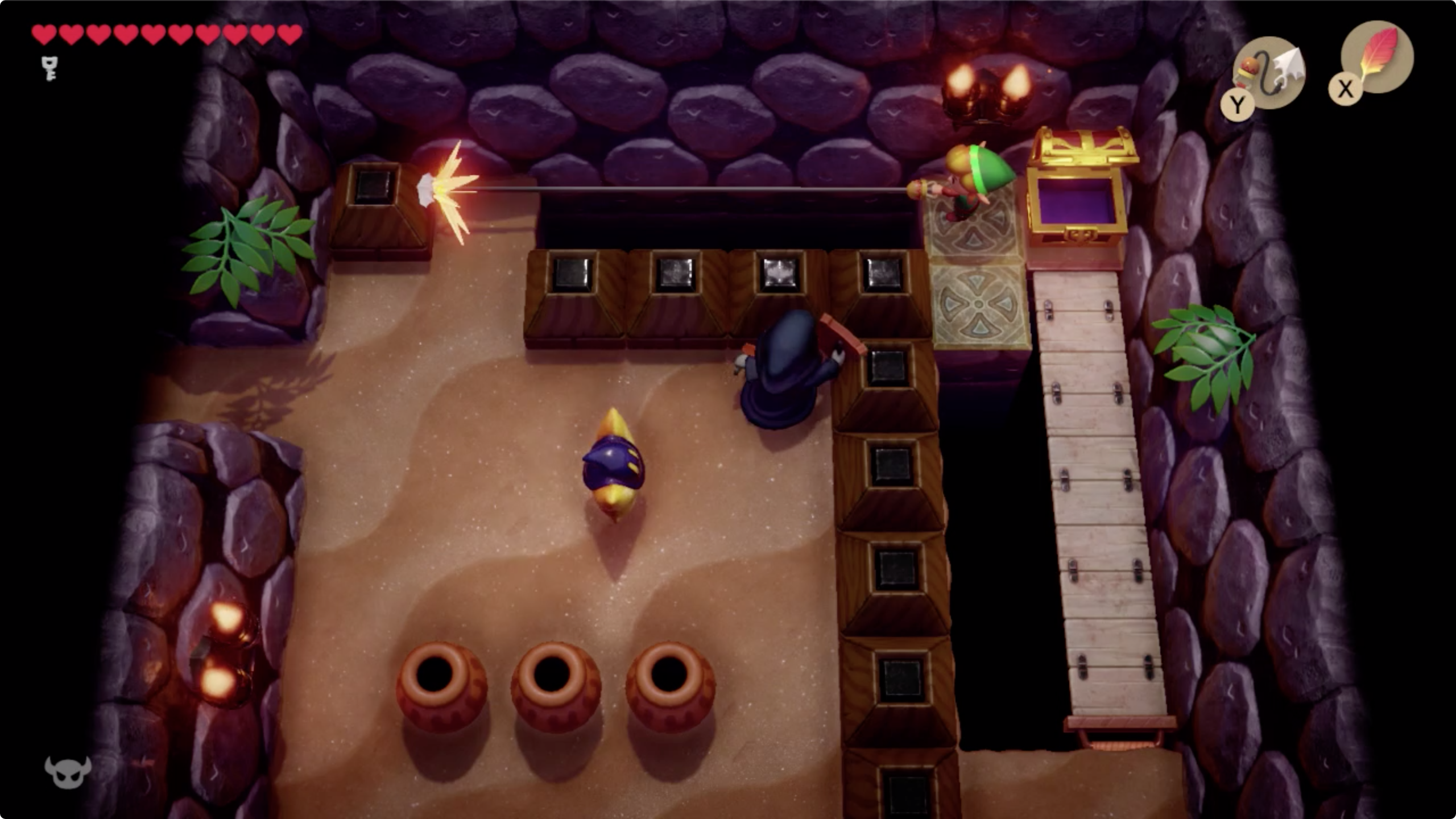 17. 이곳에서도 후크샷을 이용해 길을 만들어 갑시다. 위쪽 방으로 이동한 후 열쇠를 이용해 문을 열고 왼쪽방으로 이동합니다. [▲◀︎]
