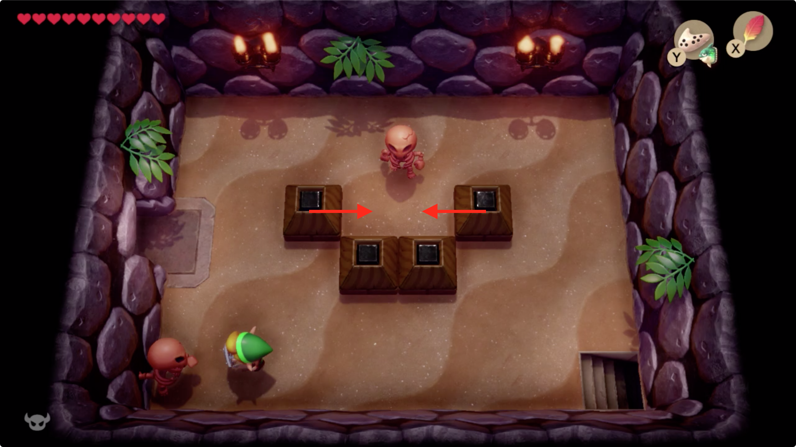 24. 계단을 빠져나온후 열쇠를 이용해 막힌 길을 열고 후크샷을 이용해 건너편이동 한 후, 보스방의 열쇠를 이용해 위쪽 방으로 이동하자 [▲]