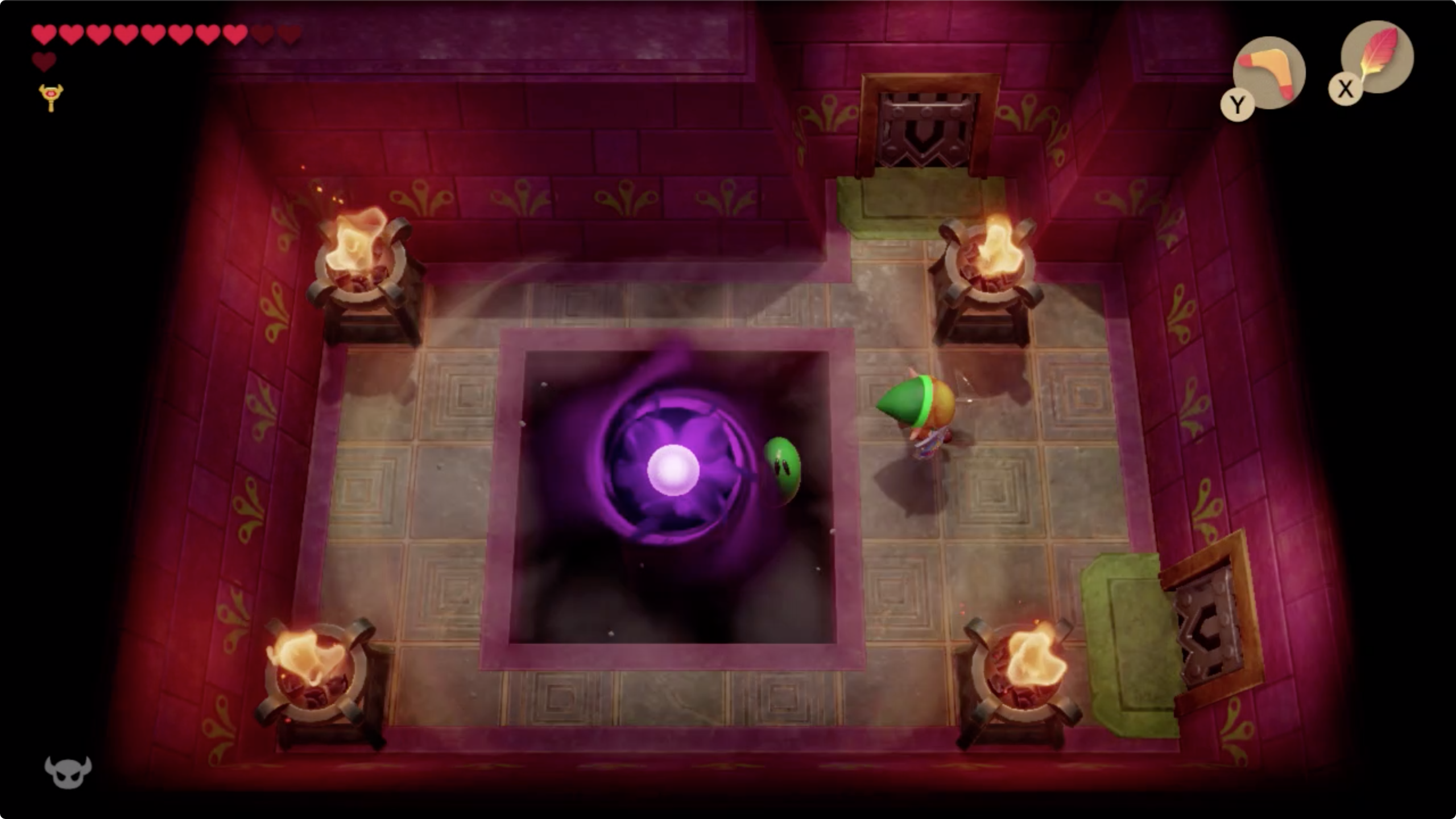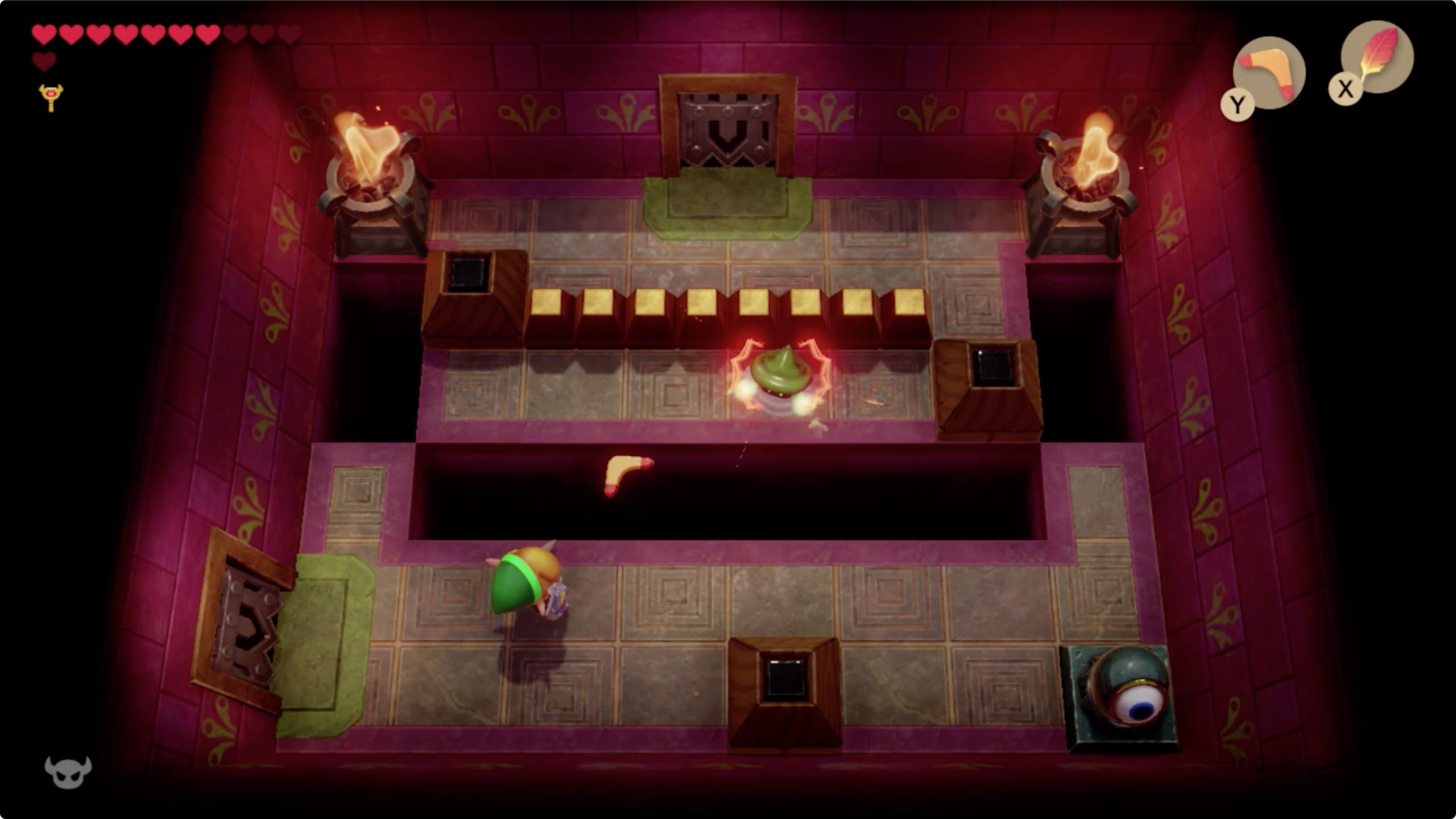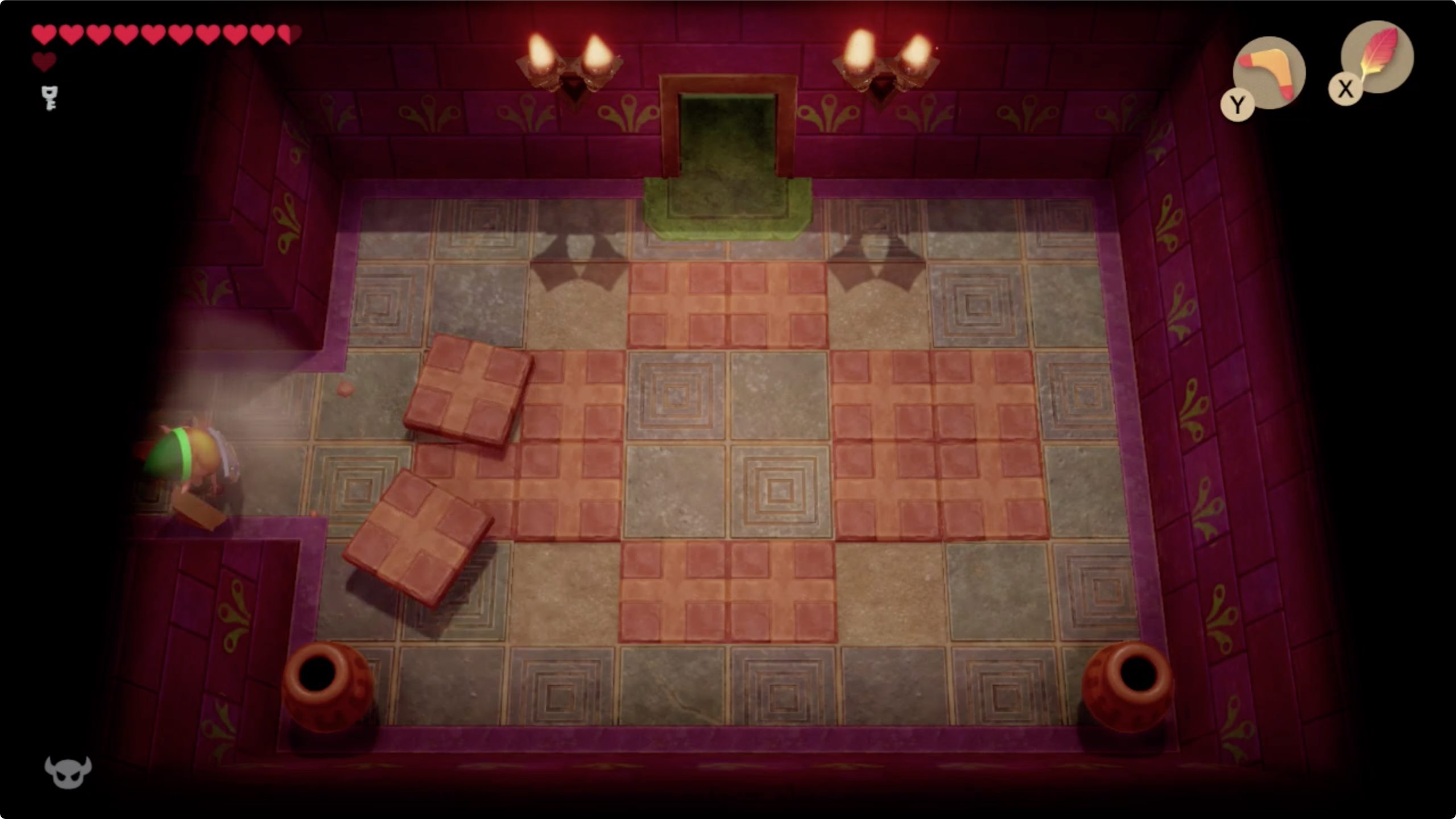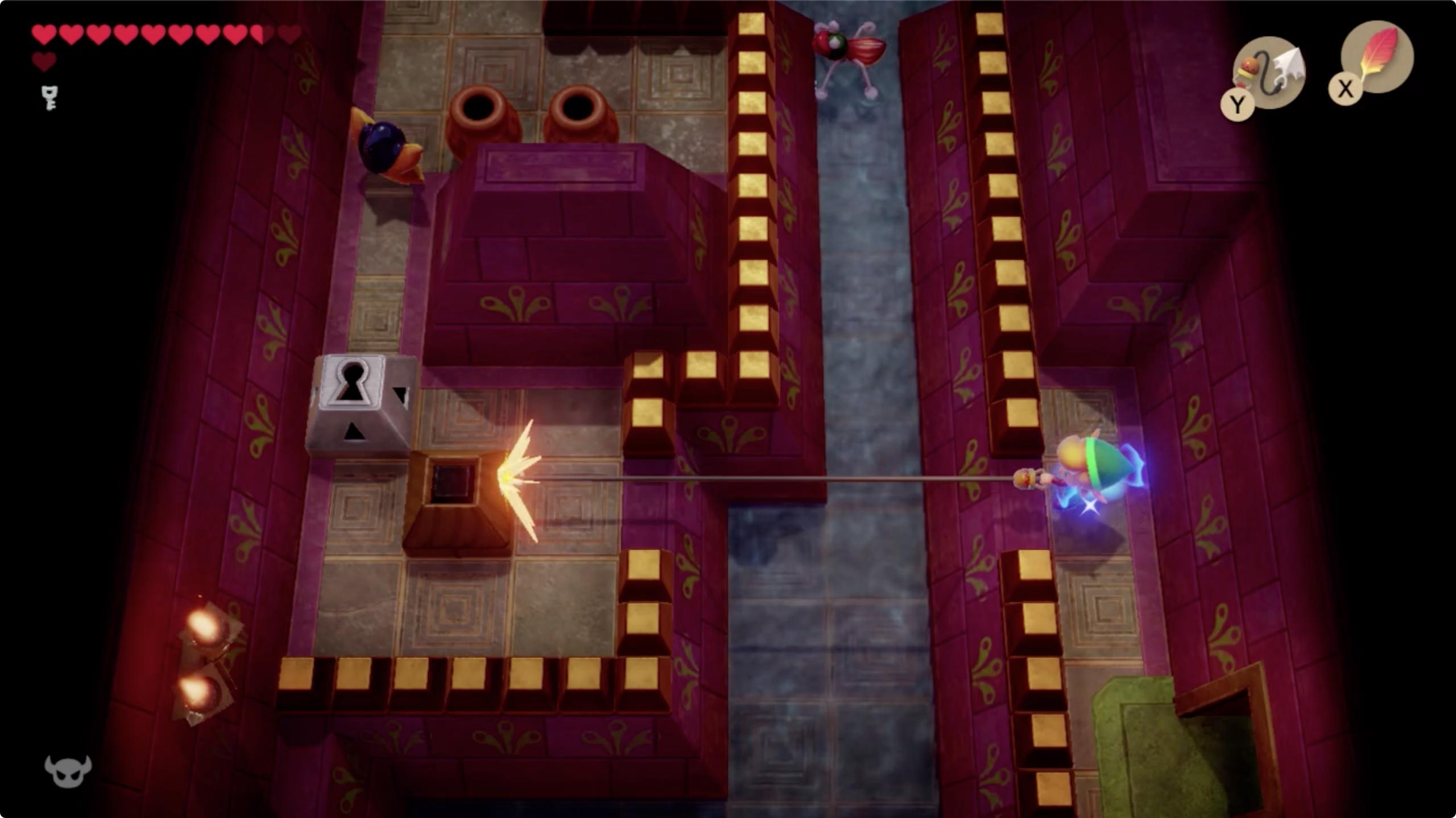여기서 아래로 그리고 왼쪽으로 이동하면 아까 수로가 있던 방이 나온다. 이제 열쇠가 한개 있으니 후크샷을 이용해 건너편으로 건너가 열쇠로 열고 보물상자를 획득하자 (보물상자는 항아리를 던져서 열 수 있다)