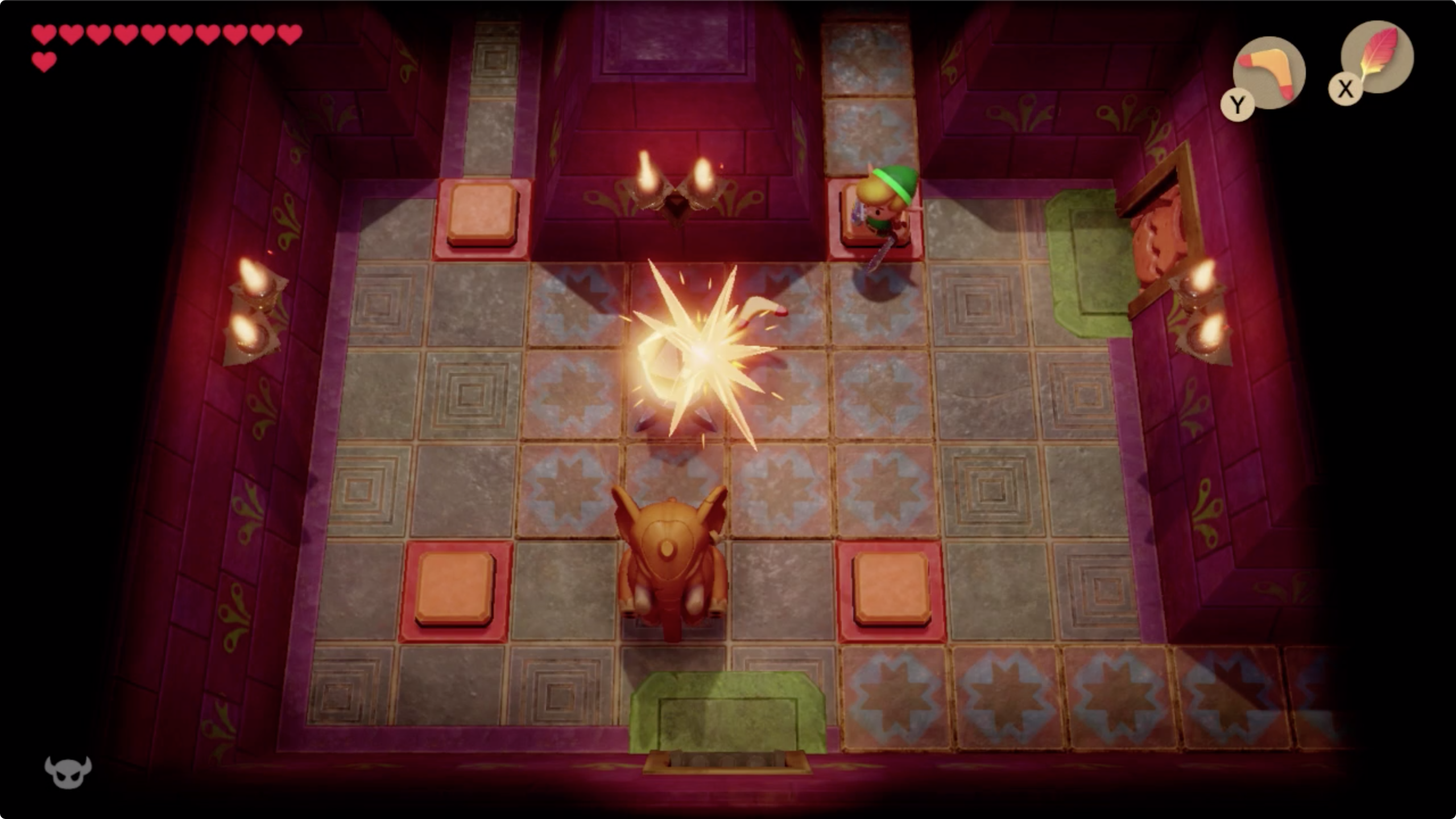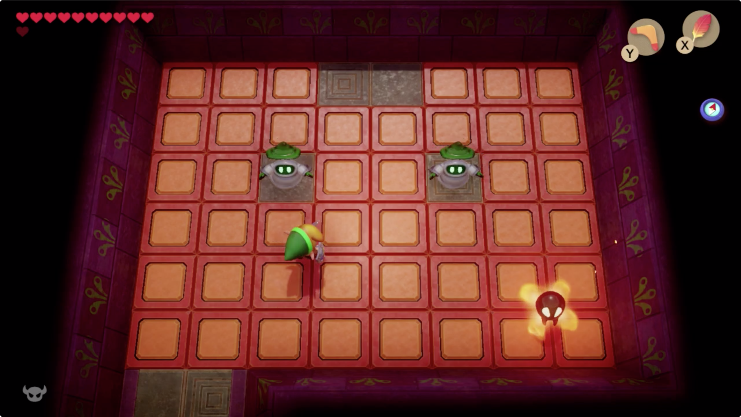 왼쪽방의 적은 부메랑으로 모두 쓰러뜨릴 수 있습니다. 부메랑은 칸막이 넘어로도 날릴수 있으니 건너편의 적도 이걸로 잡아주면 됩니다.