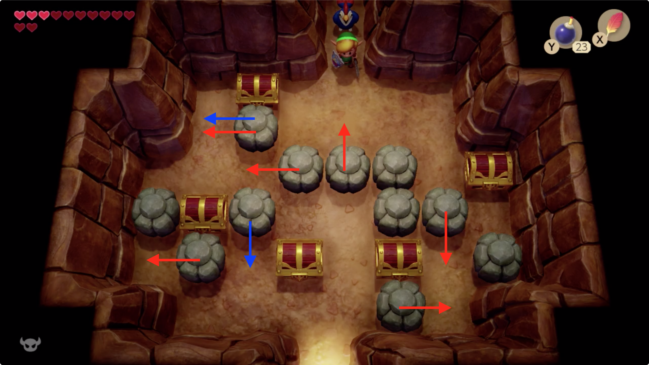 우선 파란색 화살표대로 밀어서 아래쪽으로 빠져나간 후, 다시 들어와서 빨간 화살표 방향대로 밀어주면 모든 상자를 열수 있다.
