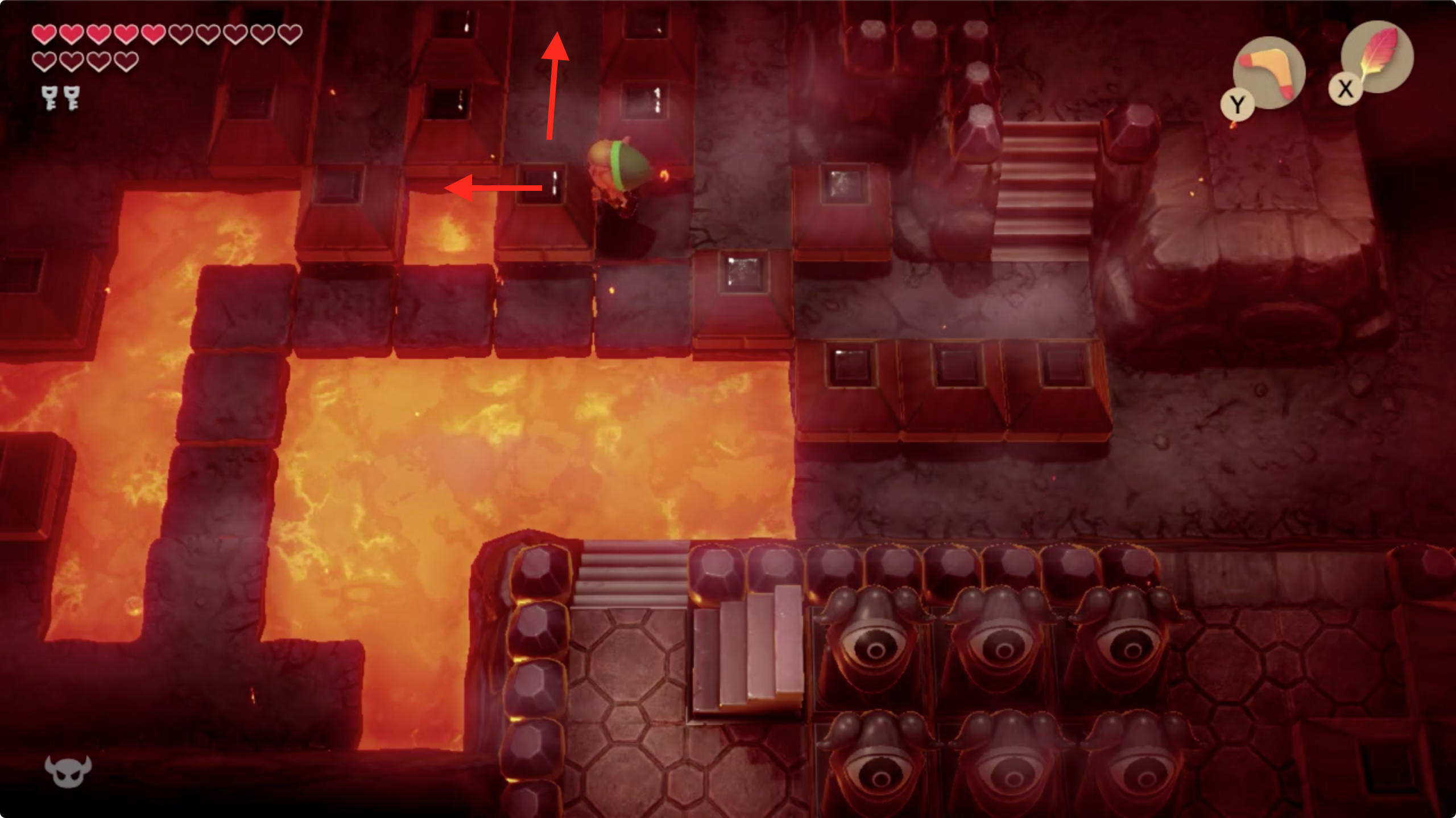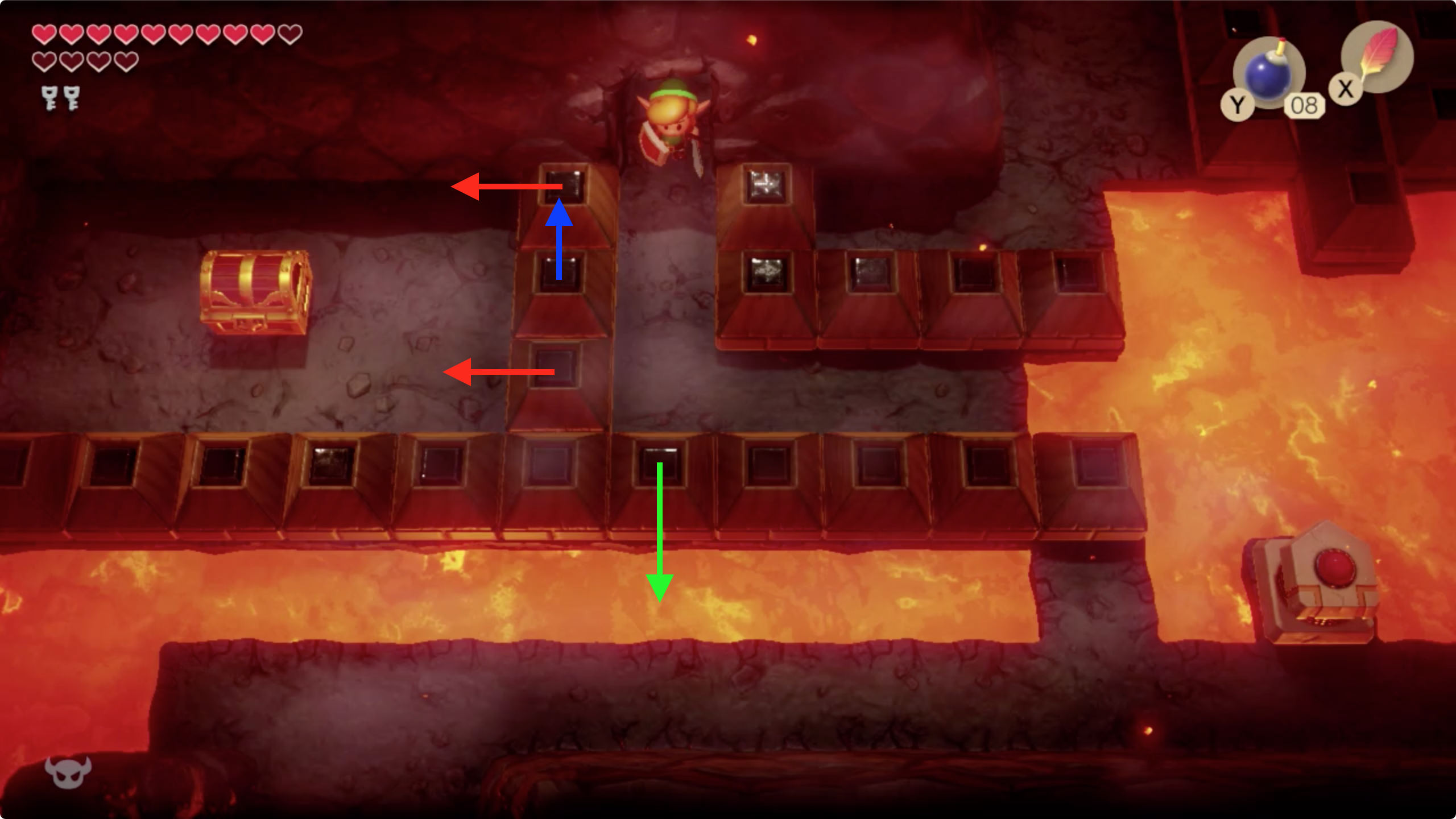 33. 입구에서부터 위로 2칸 이동하면 넓은 용암이 있고 발판으로 길을 만드는 맵이 나타난다 [▲▲]