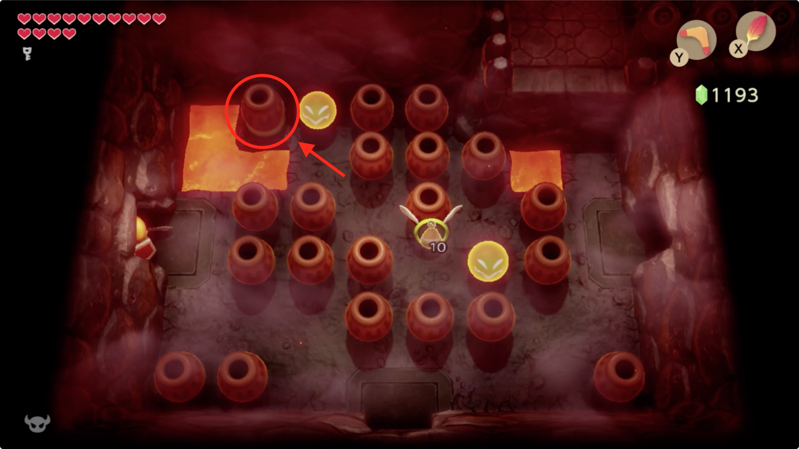 10. 항아리 아래쪽에 있는 스위치를 밟으면 문이 열립니다. 아래쪽 방으로 이동 [▼]