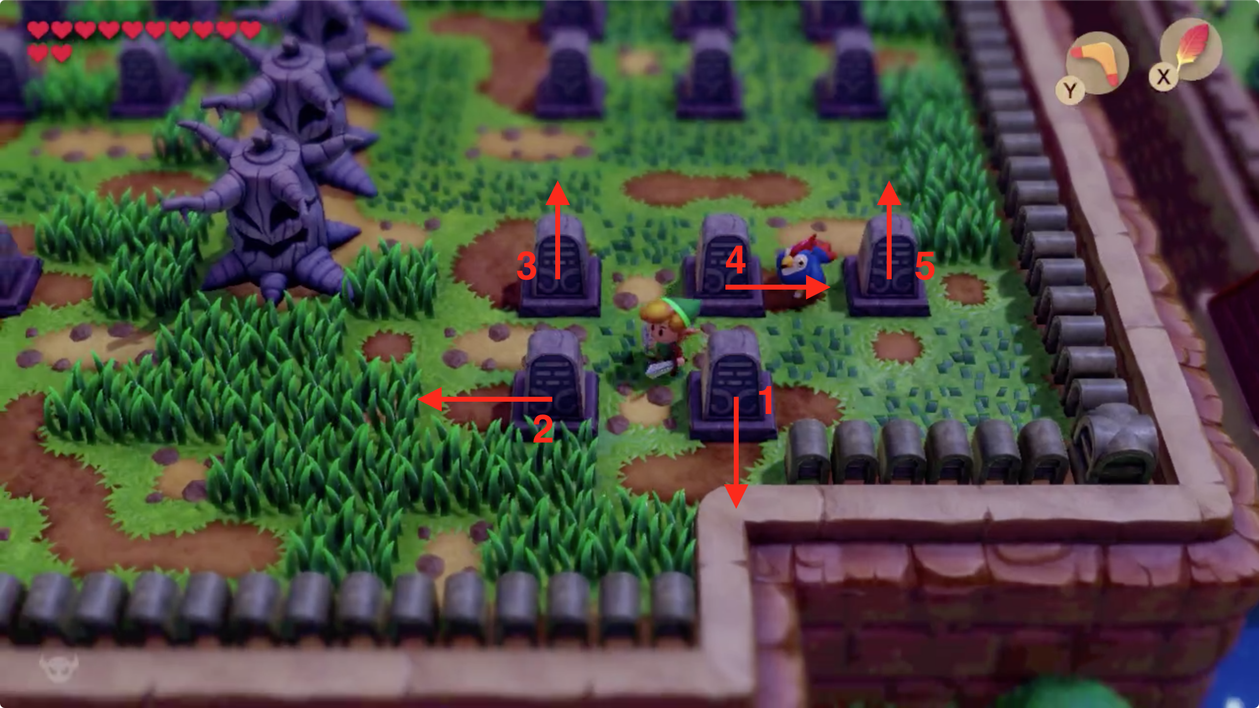 책에서 본 순서대로 1번부터 5번까지 화살표 방향에 따라 비석을 밀어주면 던전으로 갈 수 있는 숨겨진 계단이 나타납니다.