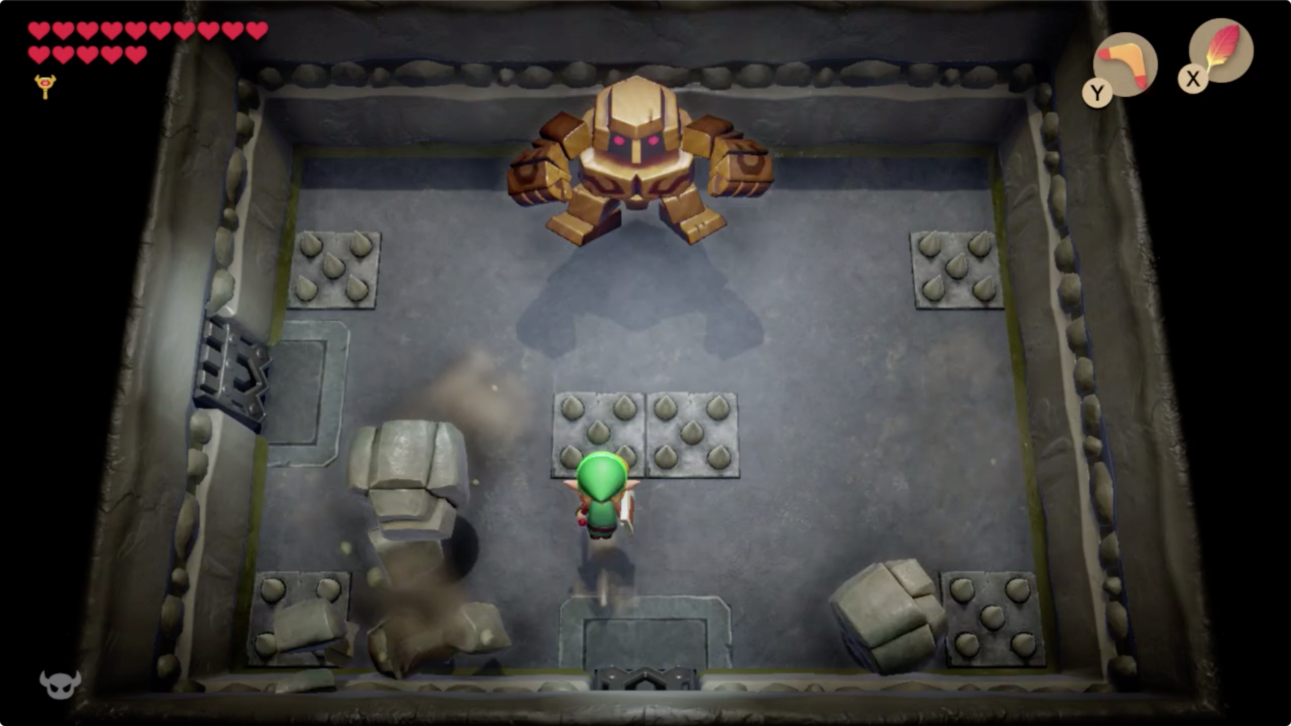 점프를 하여 천장에서 돌을 떨구어 낸다. 보스가 점프 착지할때는 지진 판정이 있으니 점프로 피해야 한다. 원거리 무기를 적극 활용하자.