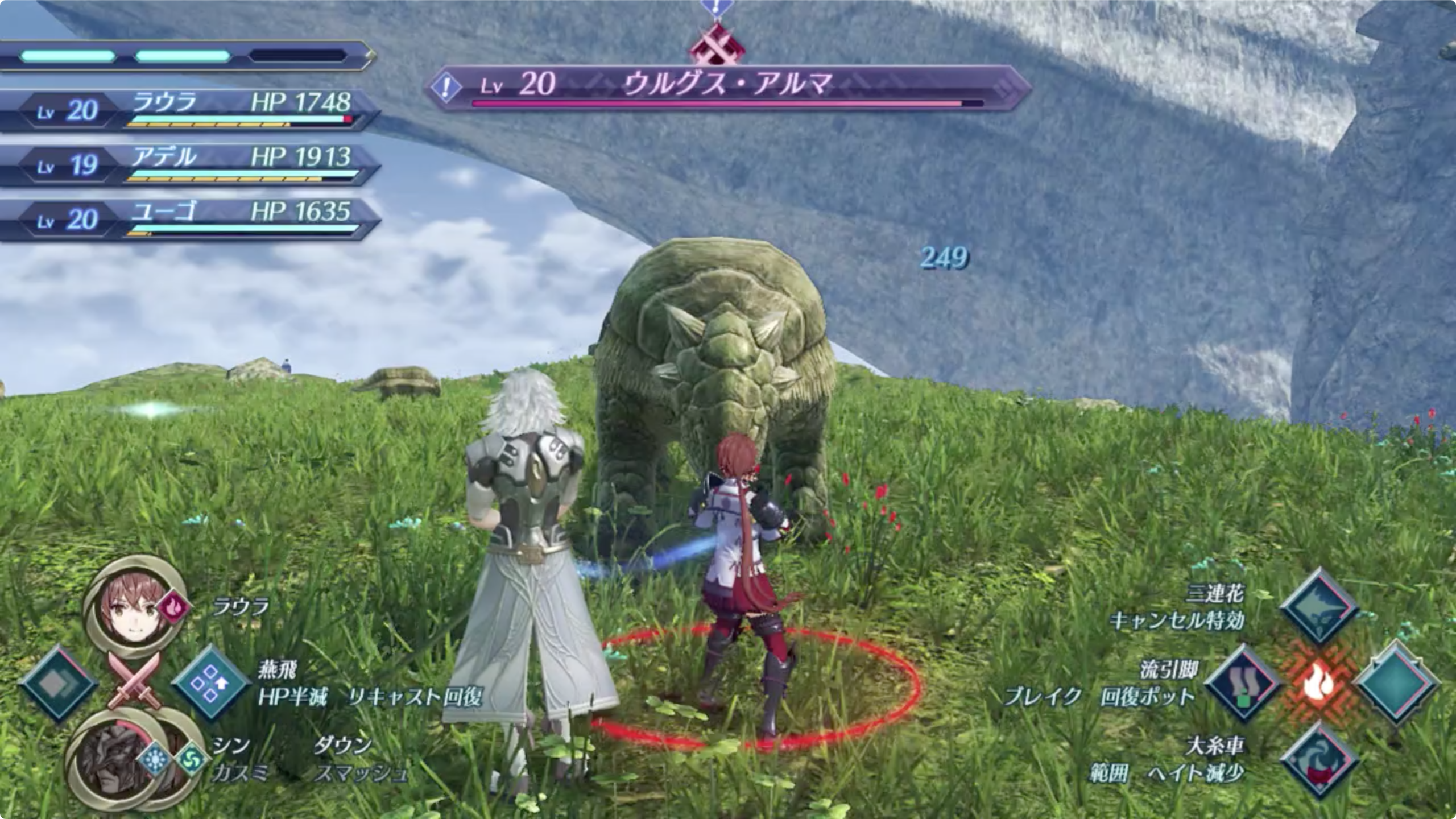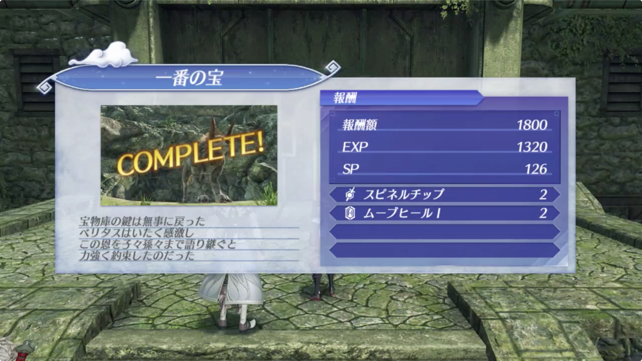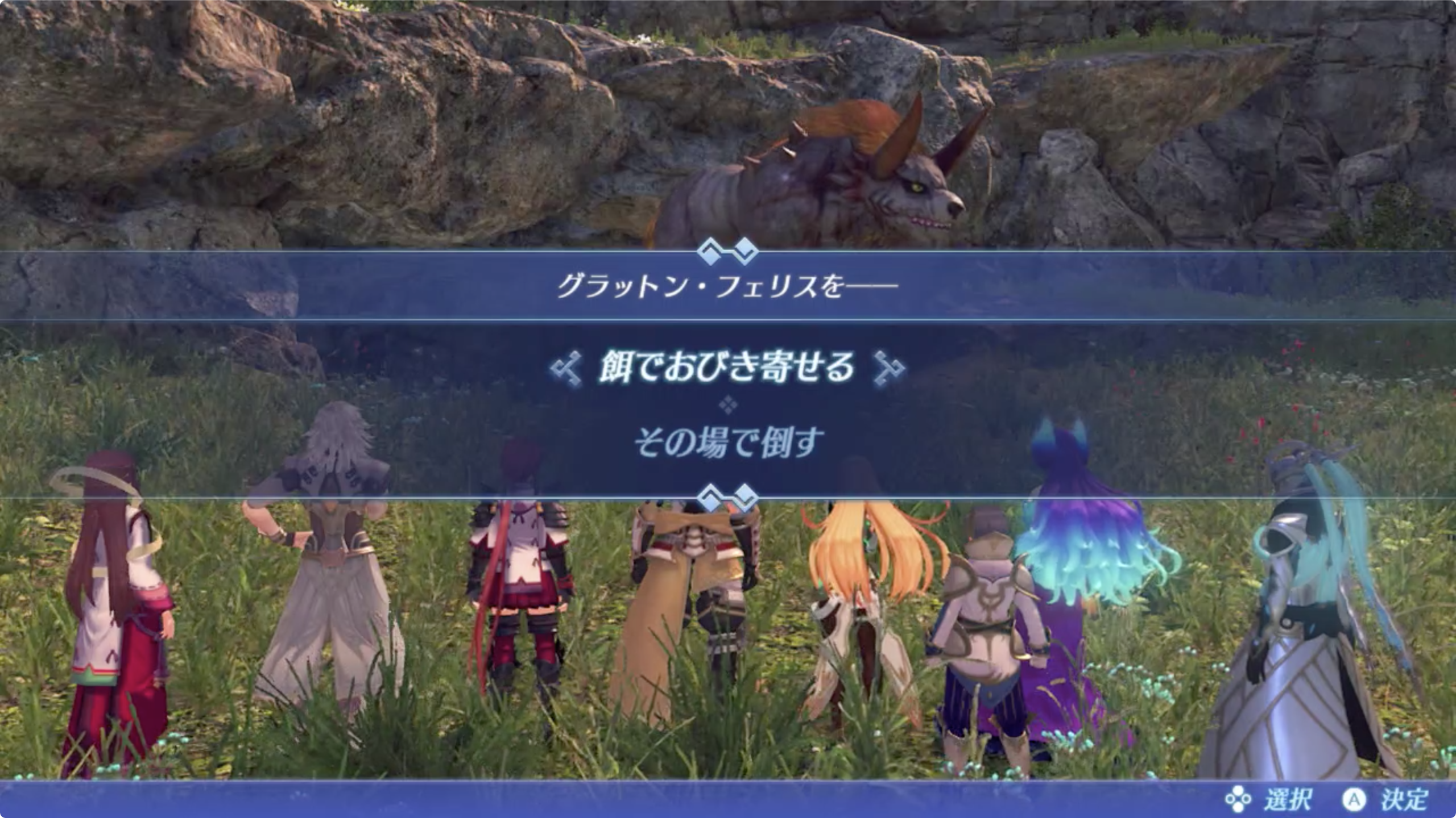- 그랏톤 페리스 (グラットン・フェリス) Lv.35 가 있는데 먹이로 유인할 것인지 (餌でおびき寄せる) 그대로 쓰러뜨릴 것인지 (その場で倒す) 선택. 스토리 진행하면서 바로 하는것이라면 레벨이 부족할테니 미끼로 유인을 추천.
