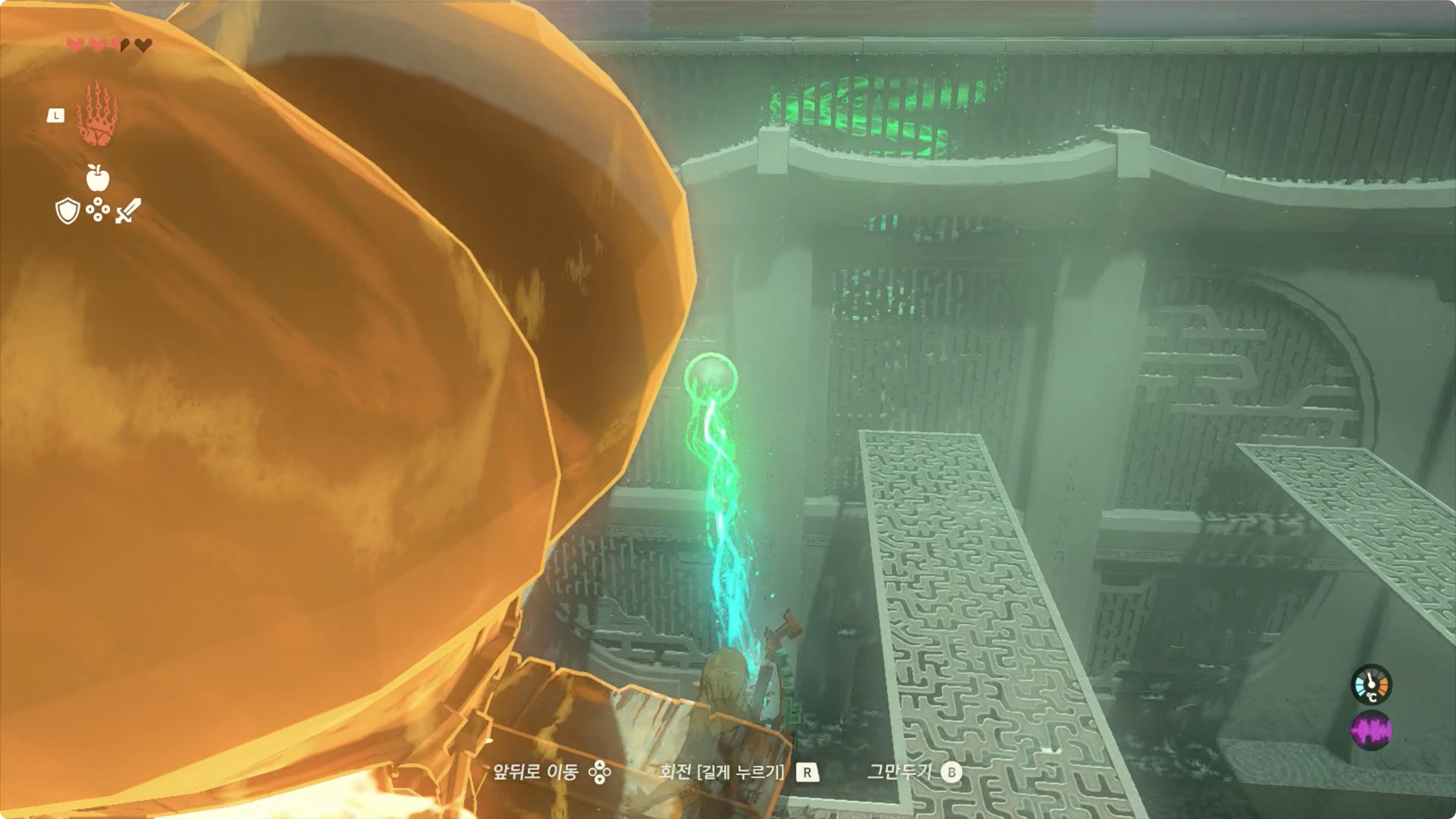 위쪽에 도착했다면 '울트라 핸드'로 구슬만 때어내서 구멍을 향해 던져넣으면 됩니다.