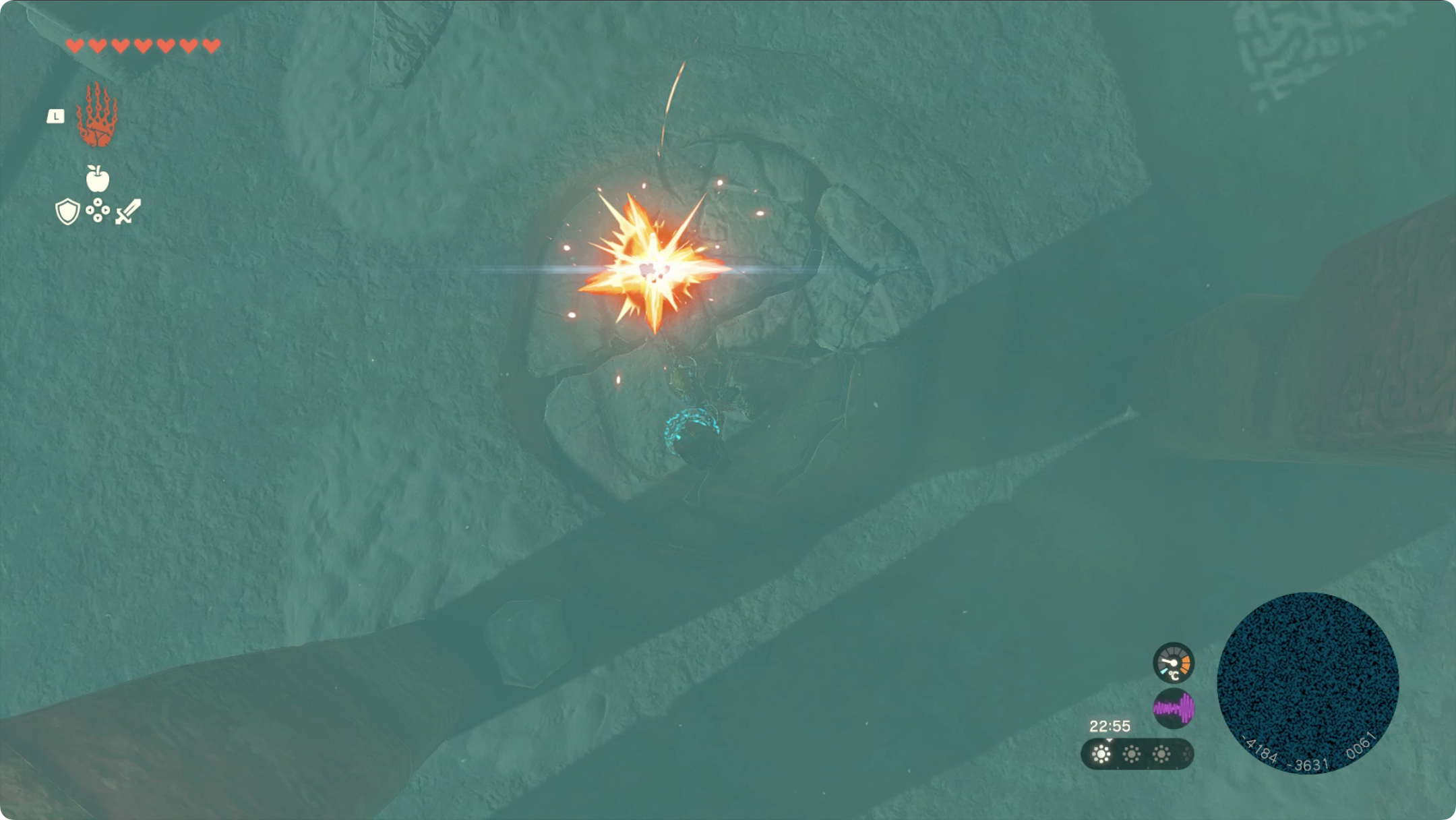 상승 기류를 이용해 위로 올라간 후, 중앙의 바위를 파괴합니다.