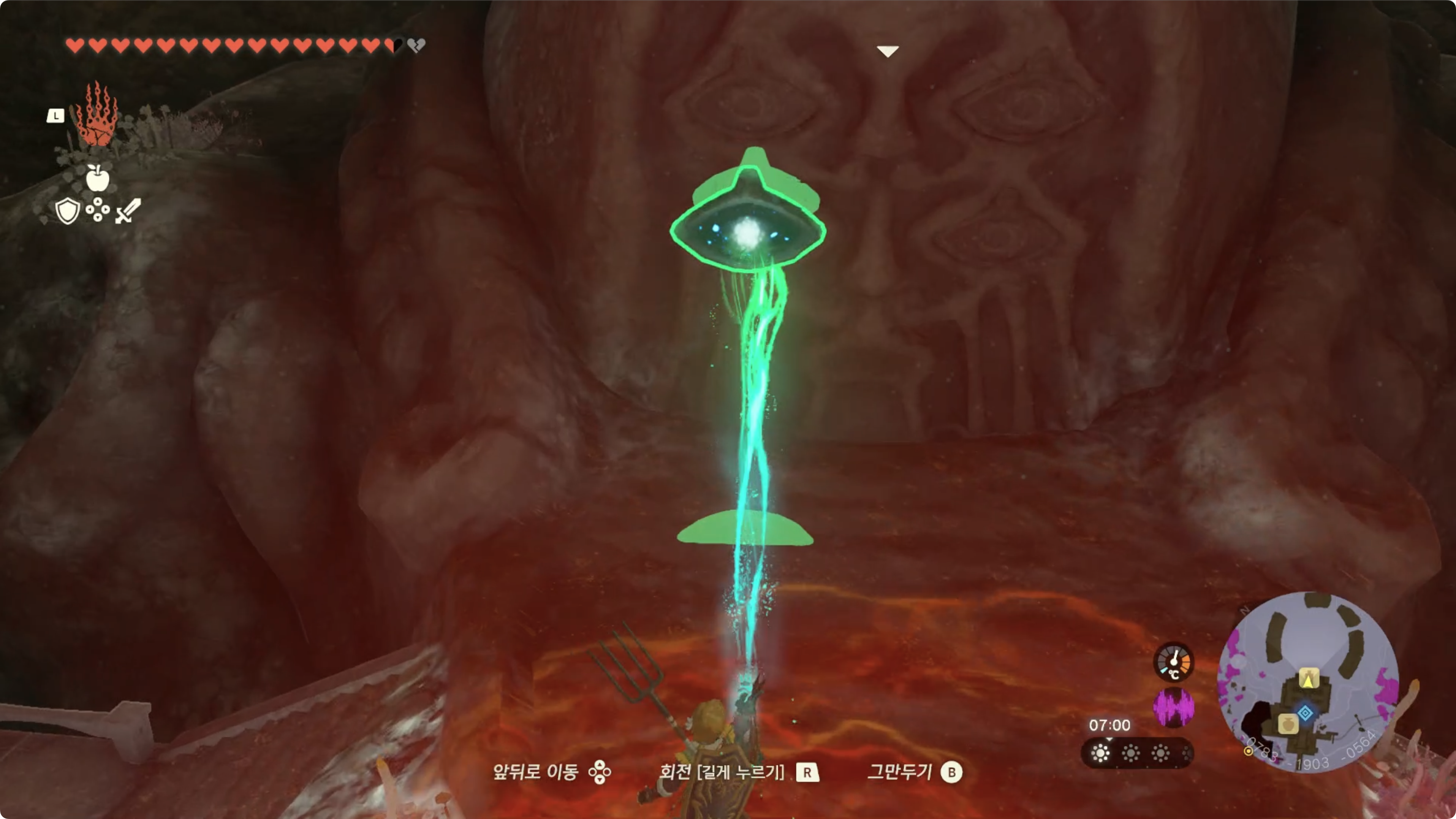 (2) 물이 빠진곳을 걸어 올라가면 마인상 얼굴을 발견할 수 있는데, 다가가서 조사를 하면 시간의 신전 옛터로 오라고 합니다.