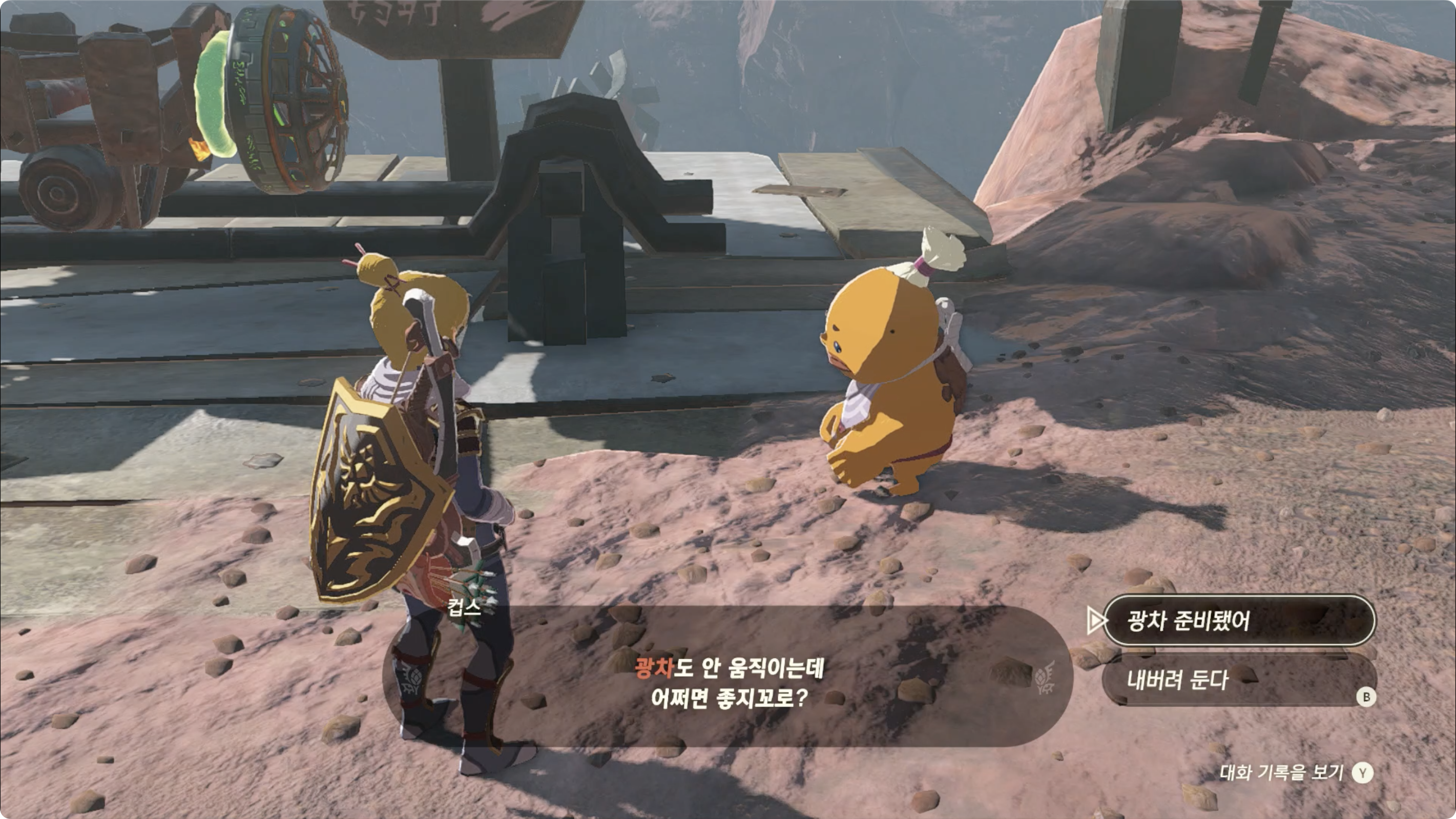 (3) 레일 위에 선풍기를 붙인 광차를 올린 후, 다시한번 컵스에게 대화를 걸어 컵스를 광차에 태웁니다.